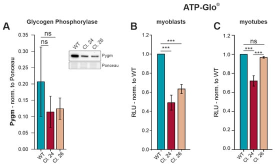 Skeletal muscle tissue has a high energy demand, mainly because of the cross-bridge cycle of sarcomere contraction. Glycogen is the major glucose storage form in myofibers, and glycogen phosphorylase is needed for glycogen breakdown into glucose-1-phosphate to make it accessible for metabolism and subsequent ATP generation. Along with reduced mRNA levels of Pygm in C2C12 GneKO myotubes (Figure 5), protein expression was similarly affected (Figure 6A). To assess whether reduced Pygm expression has direct effects on energy metabolism, intracellular ATP levels were quantified using the ATP-Glo® assay. GneKO myoblasts contained 40–50% less ATP than wild-type myoblasts (Figure 6B). Intriguingly, only GneKO clone #24 myotubes exhibited a reduction in ATP, while clone #26 had comparable amounts as wild-type myotubes (Figure 6C).