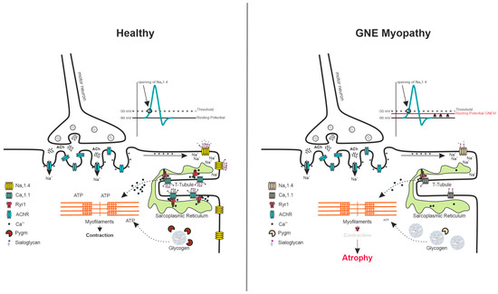 Possible disease mechanism of GNE myopathy. Alterations in the membrane potential of myofibers, due to hyposialylation, could cause an atrophic signaling cascade. Acetylcholine receptors at the neuromuscular junction receive the action potential from the motor neurons and pass the signal to voltage-gated sodium channel NaV1.4. The NaV1.4 opening leads to depolarization and conformational changes in CaV1.1 that in turn activate the ryanodine receptor in the sarcoplasmic reticulum, resulting in Ca2+ efflux. See main text for further description. NaV1.4: voltage-gated sodium channel 1.4, CaV1.1: voltage-gated calcium channel 1.1, Ryr1: ryanodine receptor 1, ACh: acetylcholine, AChR: acetylcholine receptor, Pygm: muscle-specific glycogen phosphorylase, ATP: adenosine triphosphate.
