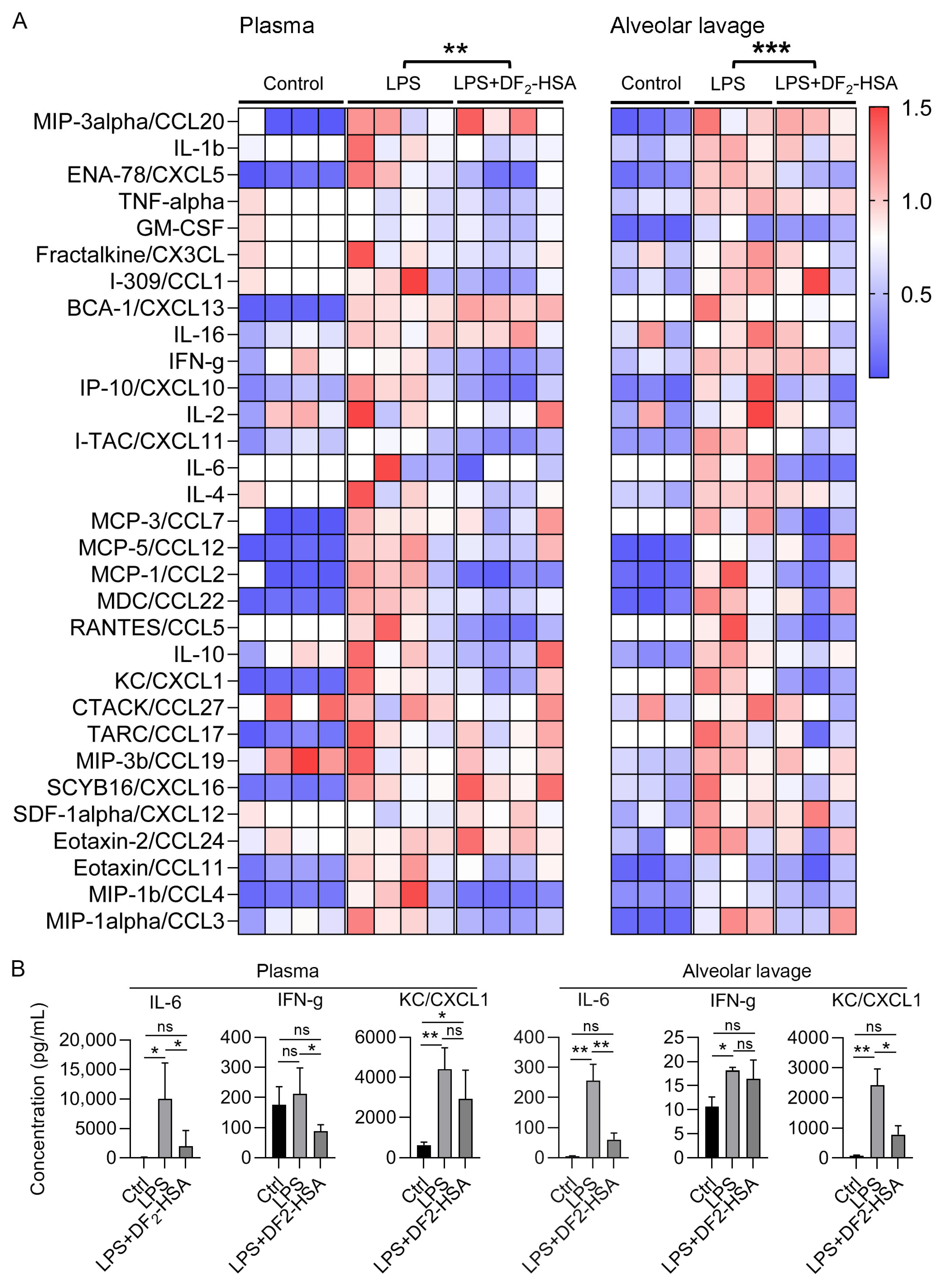 2.3. Effects of DF2-HSA on Multiple Cytokines in Plasma and Alveolar Lavage Fluid of Cytokine Storm Mice Model