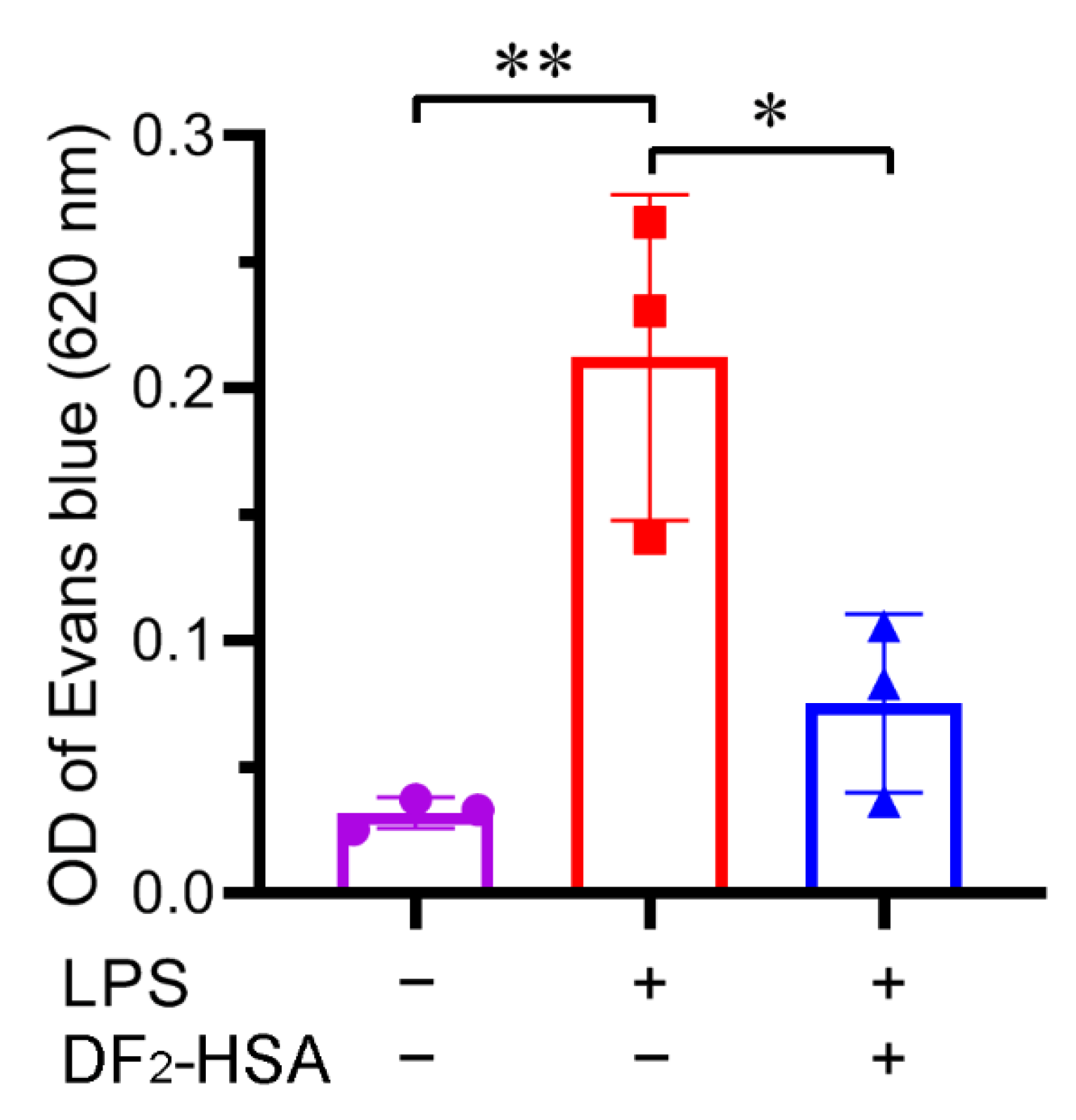 2.4. Effects of DF2-HSA on Vascular Permeability in Cytokine Storm Mice Model