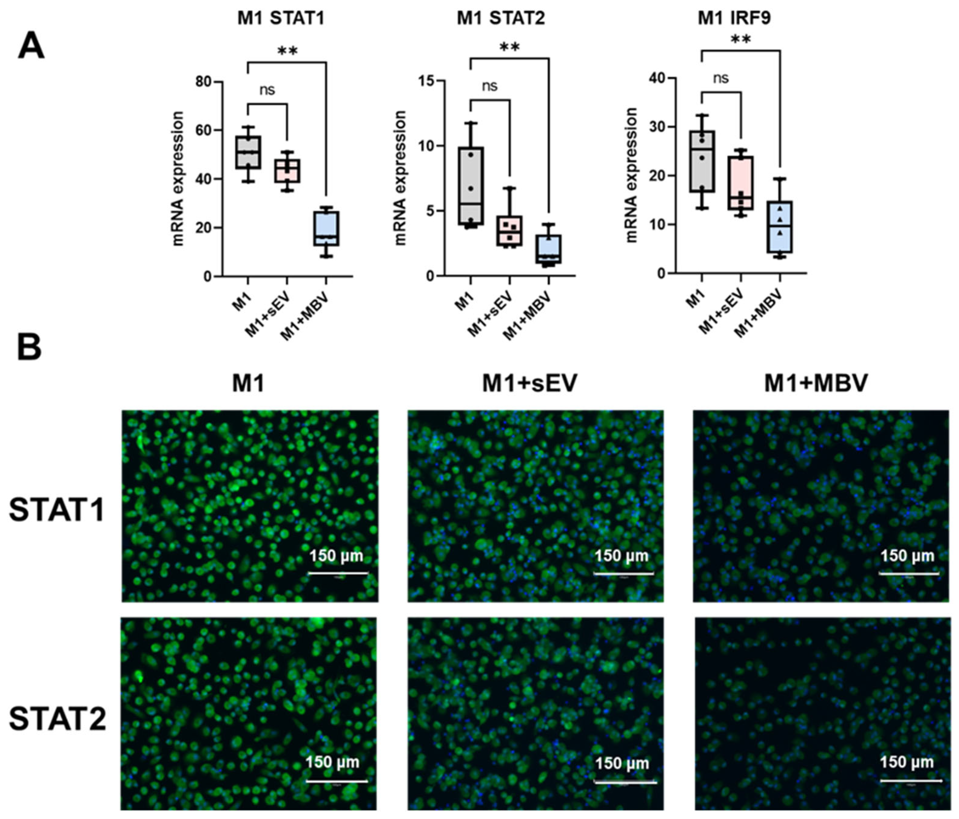 3.3. Modulation of JAK/STAT1 Components in M1 Macrophages Treated with EV UC-MSCs