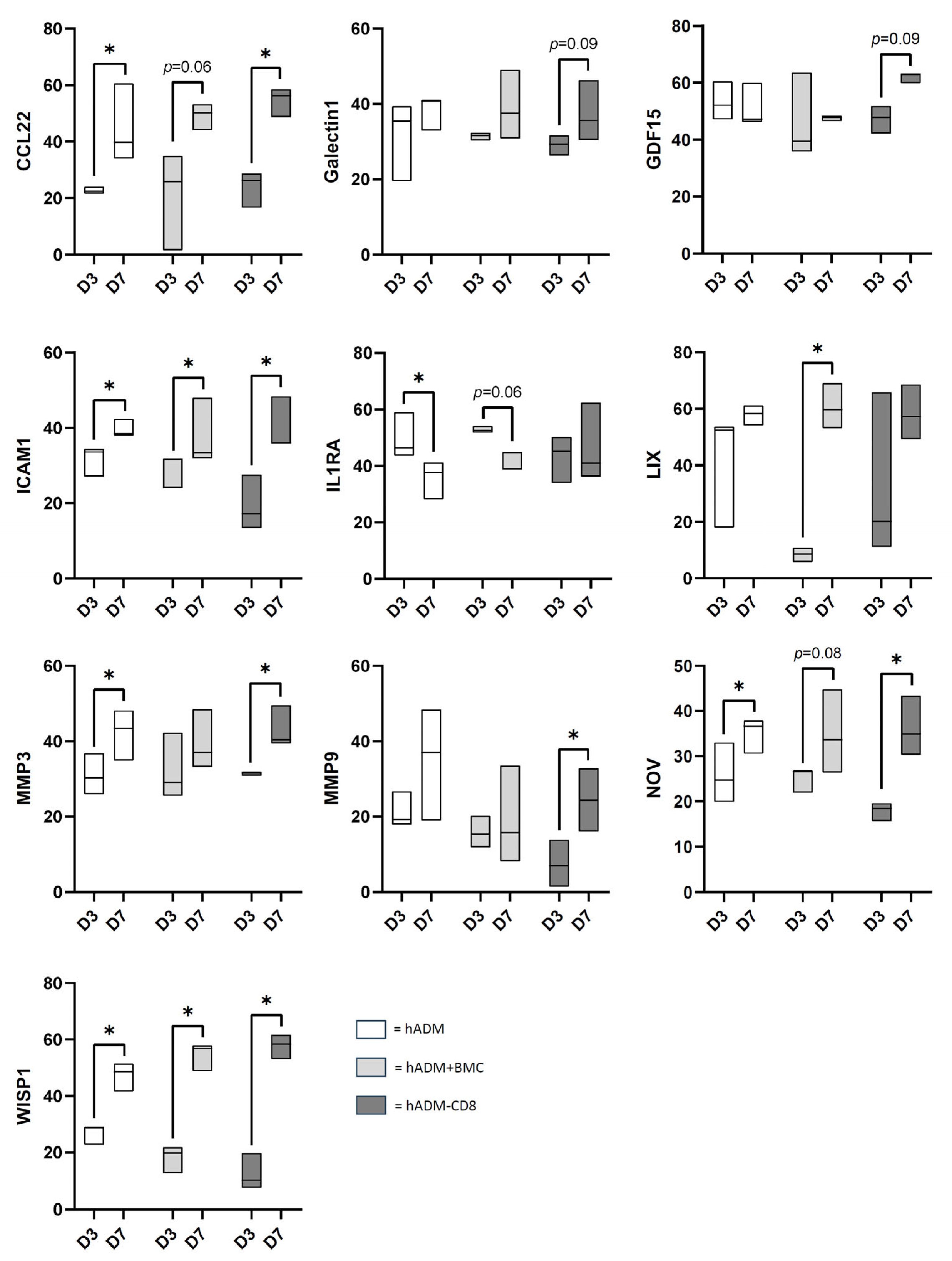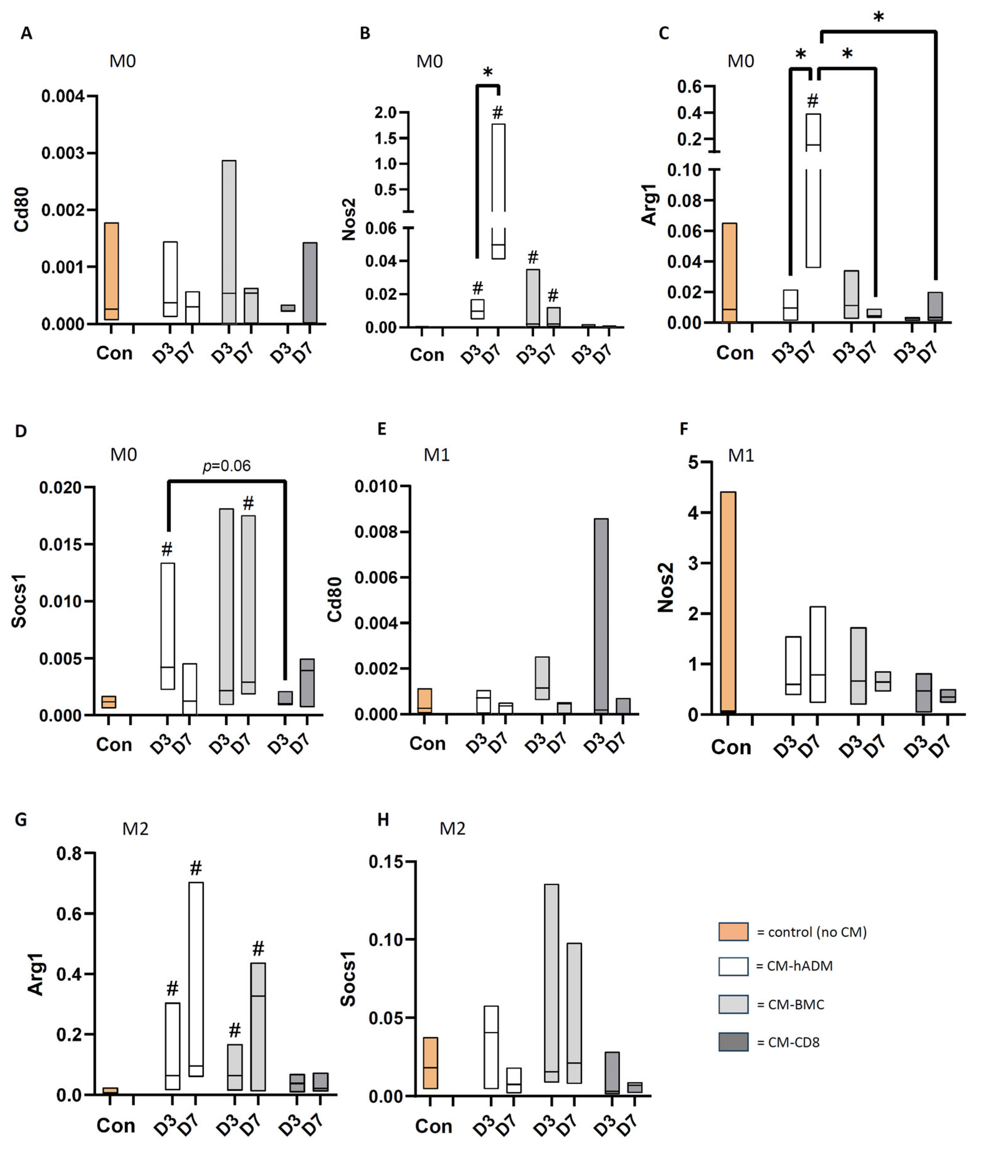 3.5. Influence of CM Generated with Differentially Treated hADM on Macrophage Polarization