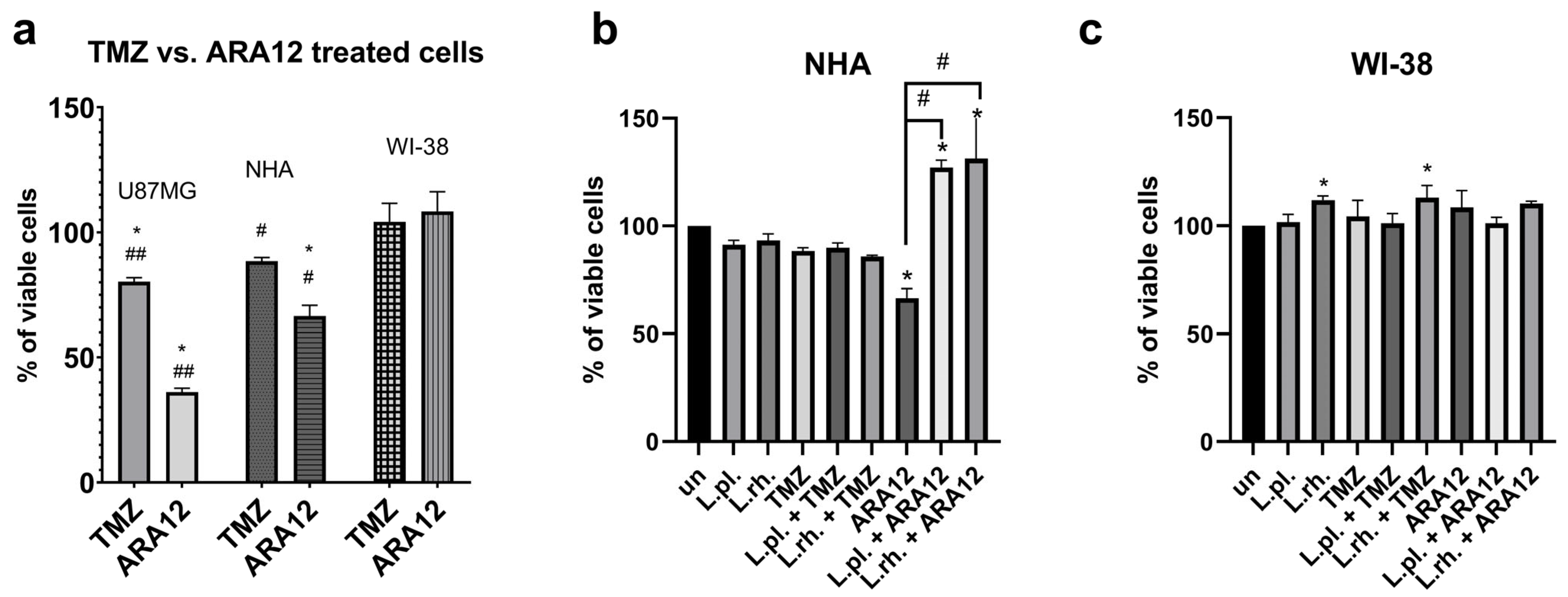 Chicago/Turabian StyleGłowacka, Pola, Agnieszka Pudlarz, Joanna Wasiak, Magdalena Peszyńska-Piorun, Michał Biegała, Karol Wiśniewski, Dariusz J. Jaskólski, Adam Marek Pieczonka, Tomasz Płoszaj, Janusz Szemraj, and et al. 2026. "Lactic Acid Bacteria Postbiotics as Adjunctives to Glioblastoma Therapy to Fight Treatment Escape and Protect Non-Neoplastic Cells from Side Effects" Cells 15, no. 3: 226. https://doi.org/10.3390/cells15030226