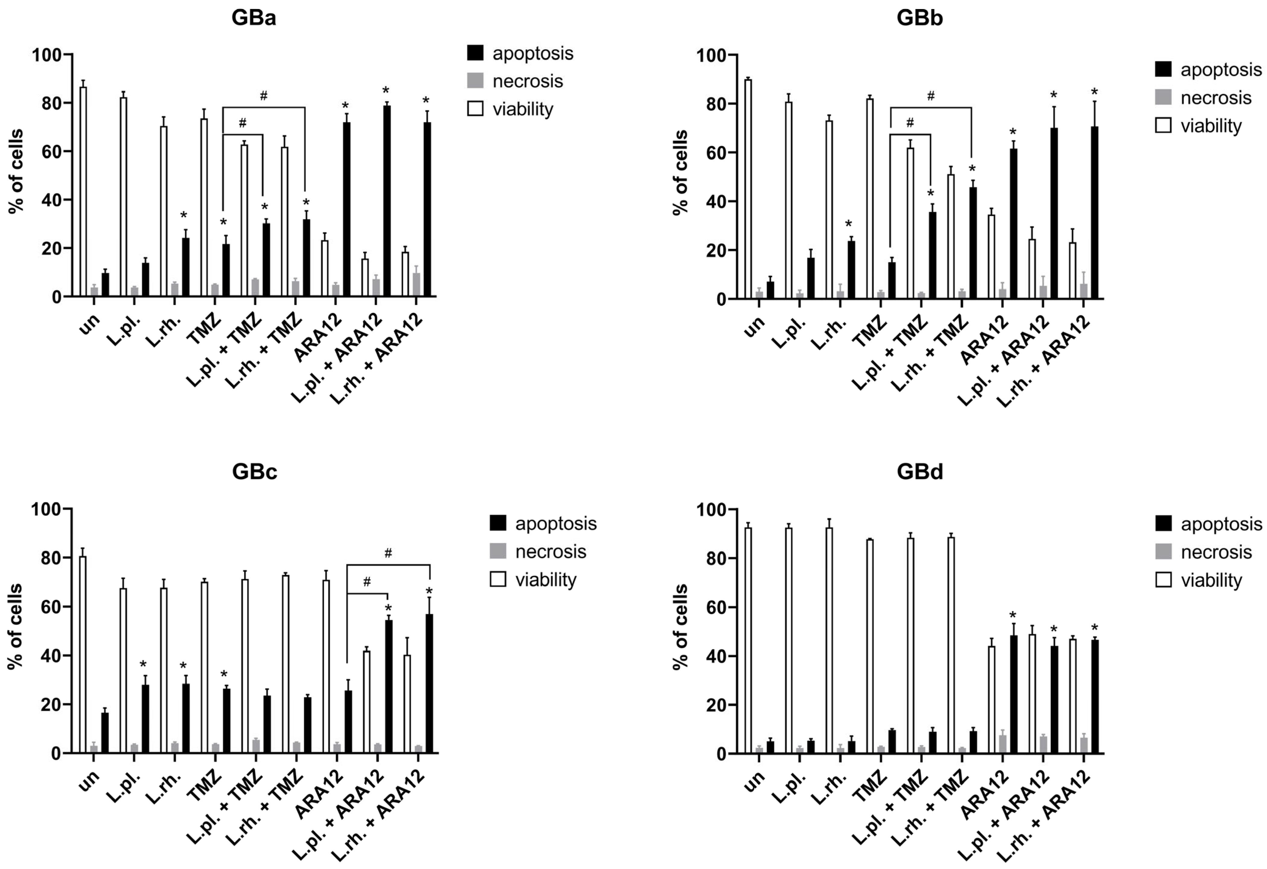 3.1. Initial Screening of L. plantarum and L. rhamnosus-Derived PM Activity Shows Cytotoxicity Towards GB Cells and Cytoprotective Potential Against Anti-Cancer Agent—ARA12