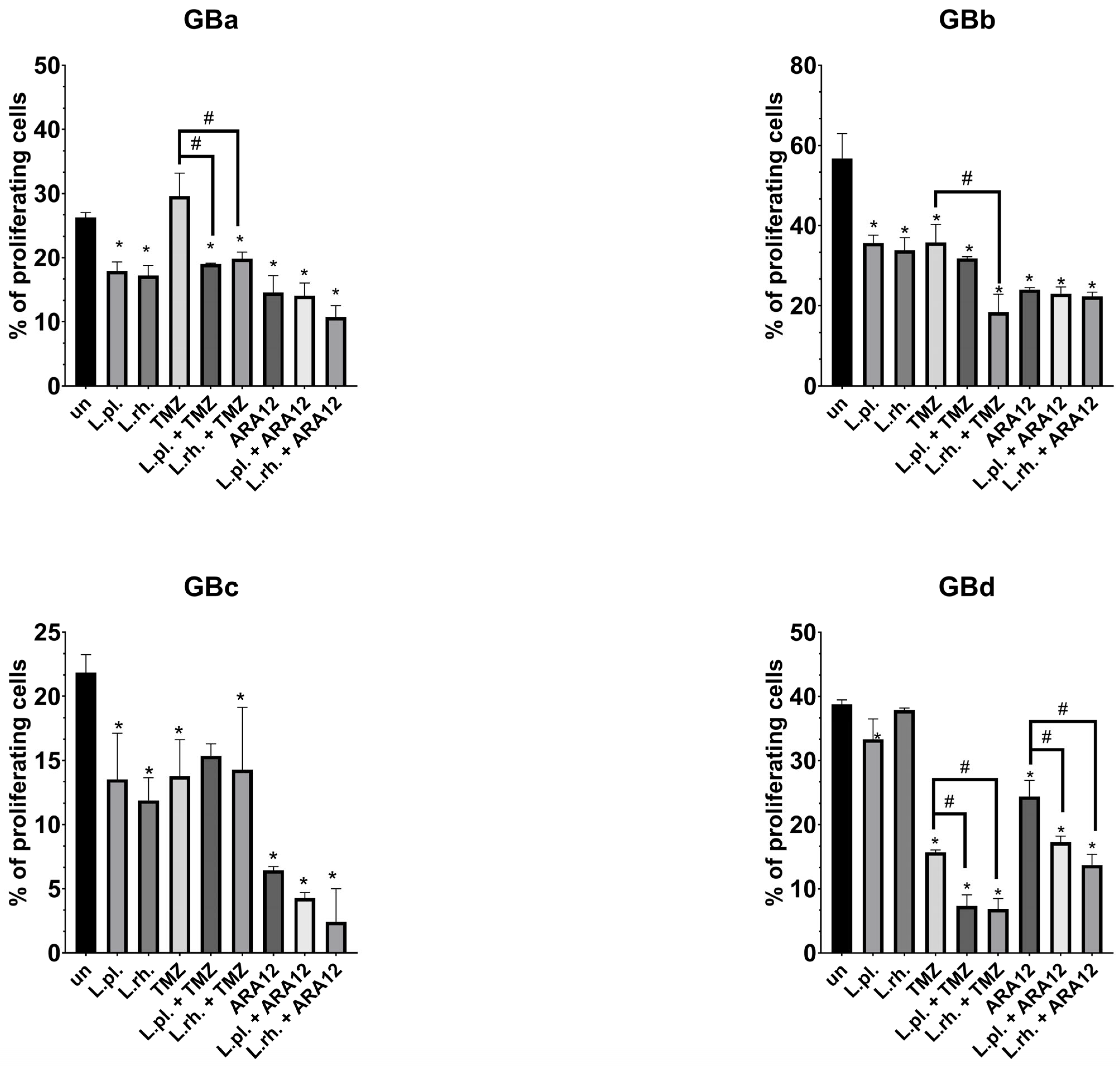 3.3. Patient-Derived GB Cell Lines Present Heterogenous Responsiveness to Proapoptotic and Antiproliferative Effect of L. plantarum- and L. rhamnosus-Derived PM in Combination with Anti-Neoplastic Drugs