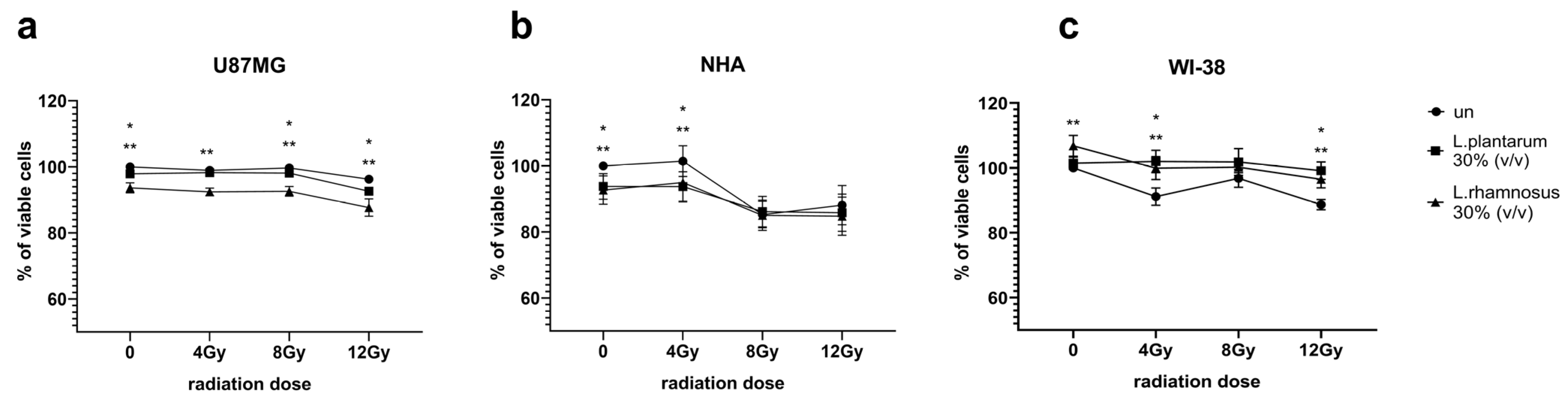 3.4. Initial Screening of L. plantarum- and L. rhamnosus-Derived PM Activity Towards GB and Normal Cells Undergoing Irradiation Process Demonstrates More Evident Influence of PM in Maximal Tested Radiation Dose