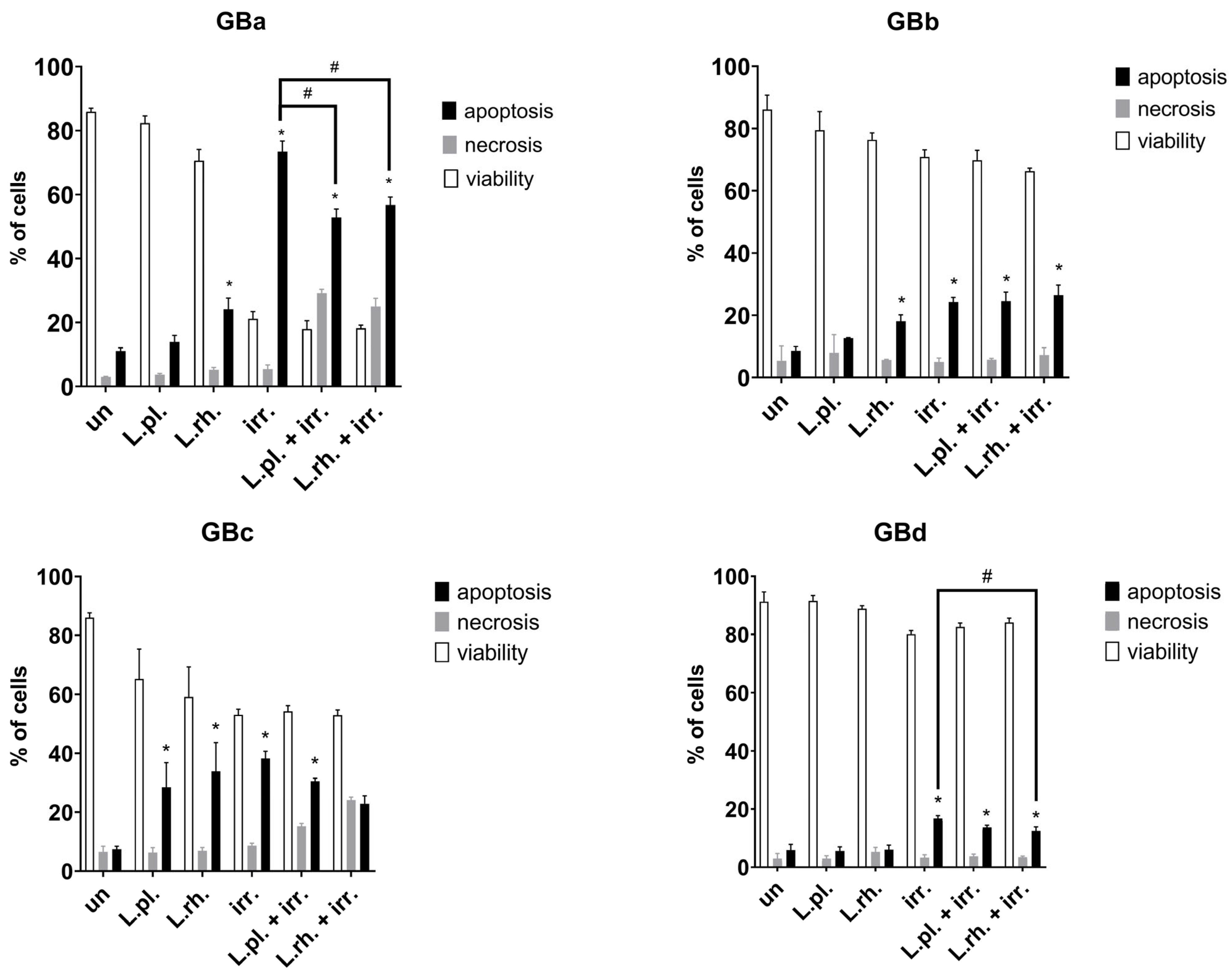 3.6. The Effect of Pretreatment with L. plantarum- and L. rhamnosus-Derived PM in Combination with Irradiation on Cell Death Processes and Proliferation Rate Varies Between Examined GB Patient-Derived Cell Lines