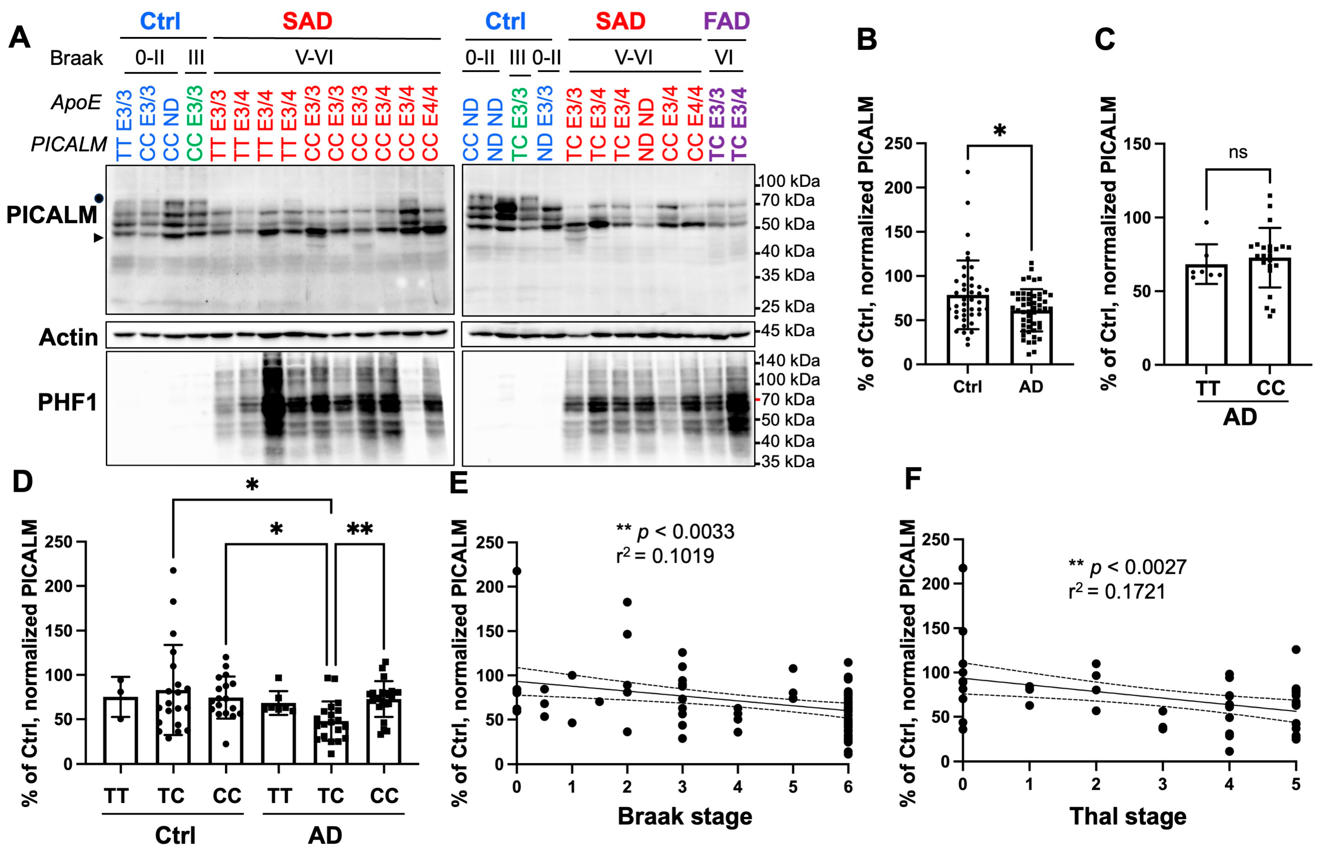 3.1.2. PICALM Is Decreased in AD Brains, and Its Level Is Not Significantly Affected by rs3851179 Genotype