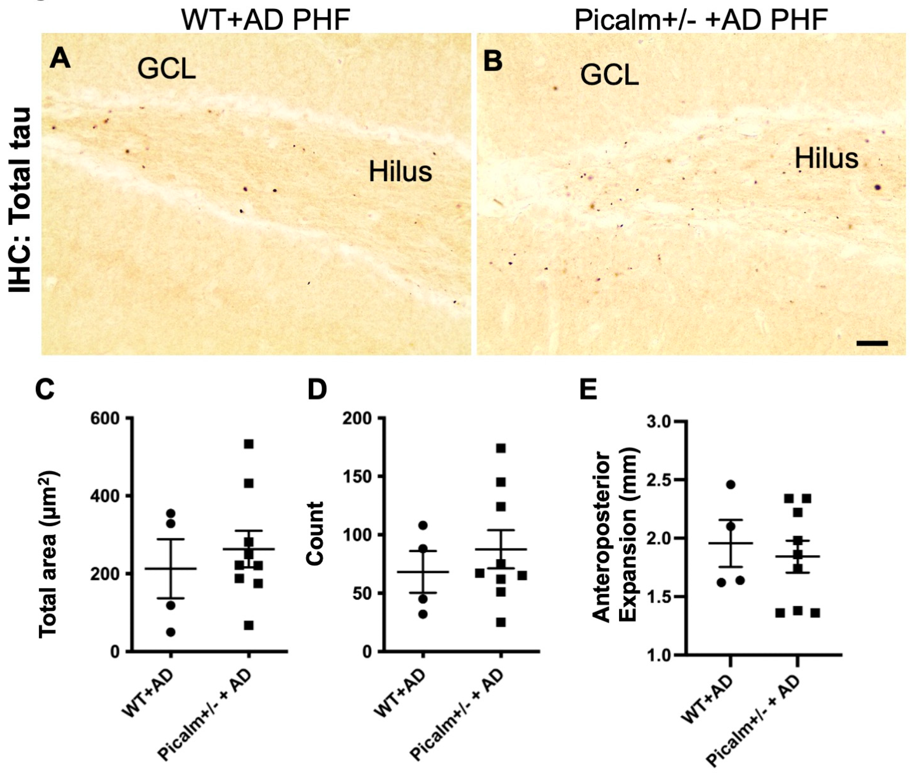 3.2. Stereotaxic Injection of AD-PHF into Wild-Type and Picalm+/− Mice Suggests No Significant Change in Tau Pathology Propagation When Picalm Expression Is Reduced by 50%