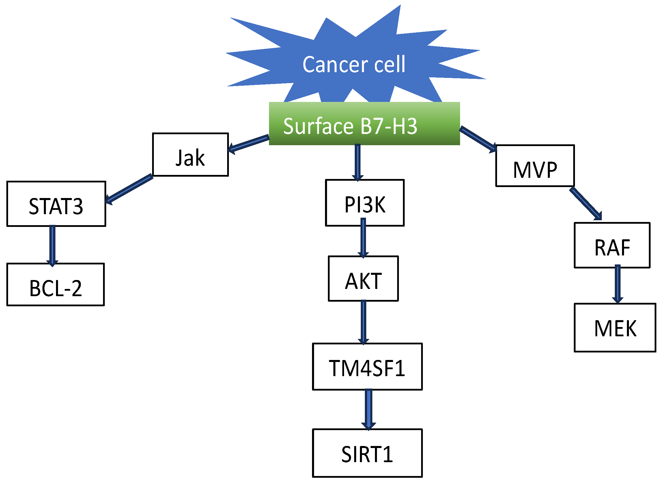 | Gastric cancer | B7-H3 modulates the metabolism of glutathione to increase the stemness of gastric cancer cells via the AKT/pAKT/Nrf2 signaling pathway. Granulocyte–macrophage colony-stimulating factor is initially produced in gastric cancer cells, activating the Jak2/Stat3 signaling pathway to mediate the activation of tumor-associated neutrophils and the expression of B7-H3. | [55,56] |