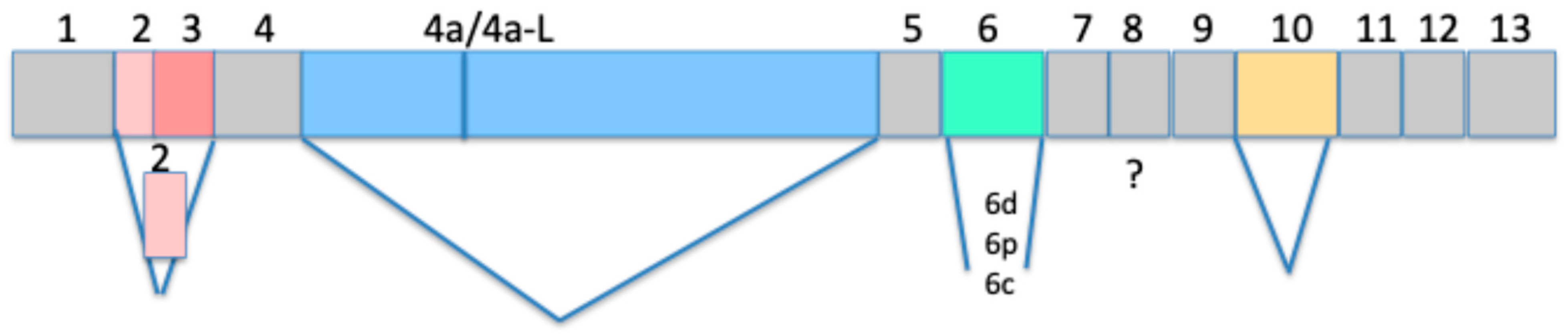 28]. Exon 4a is often included together with exon 6, but it has also been found as an isoform without exon 6 and also without exons 2 and 3, usually with exon 10 [