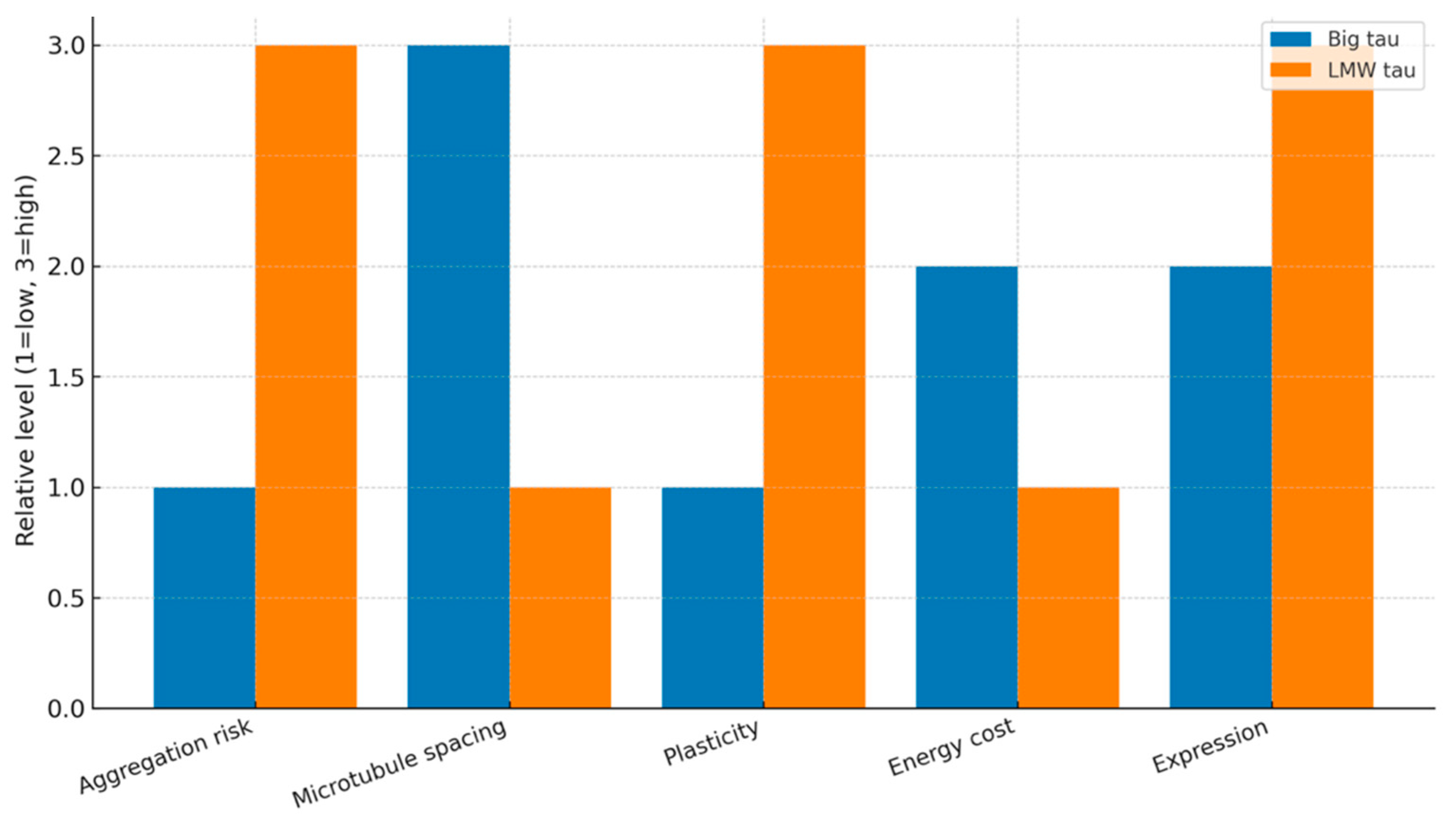 The contrast between Big tau and LMW tau also illustrates a broader evolutionary trade-off between protection and plasticity. Big tau, with its acidic, hydrophilic, and intrinsically disordered 4a insert, resists aggregation, offering a degree of protection against tauopathy-like misfolding. However, this protection comes at the expense of the fine-tuned cytoskeletal regulation needed in the CNS. LMW tau, however, is more vulnerable to aggregation, particularly with aging or under disease conditions, but it enables rapid and dynamic MT remodeling critical for cognitive flexibility. Evolution appears to have prioritized plasticity over aggregation resistance, particularly because most tauopathies manifest late in life, after the reproductive period, when evolutionary pressure is weak. Studies are underway by our team that will provide experimental evidence for these ideas (see later). These considerations suggest that the limited distribution of Big tau is not coincidental but rather reflects incompatibility with the specialized demands of CNS neurons (summarized in