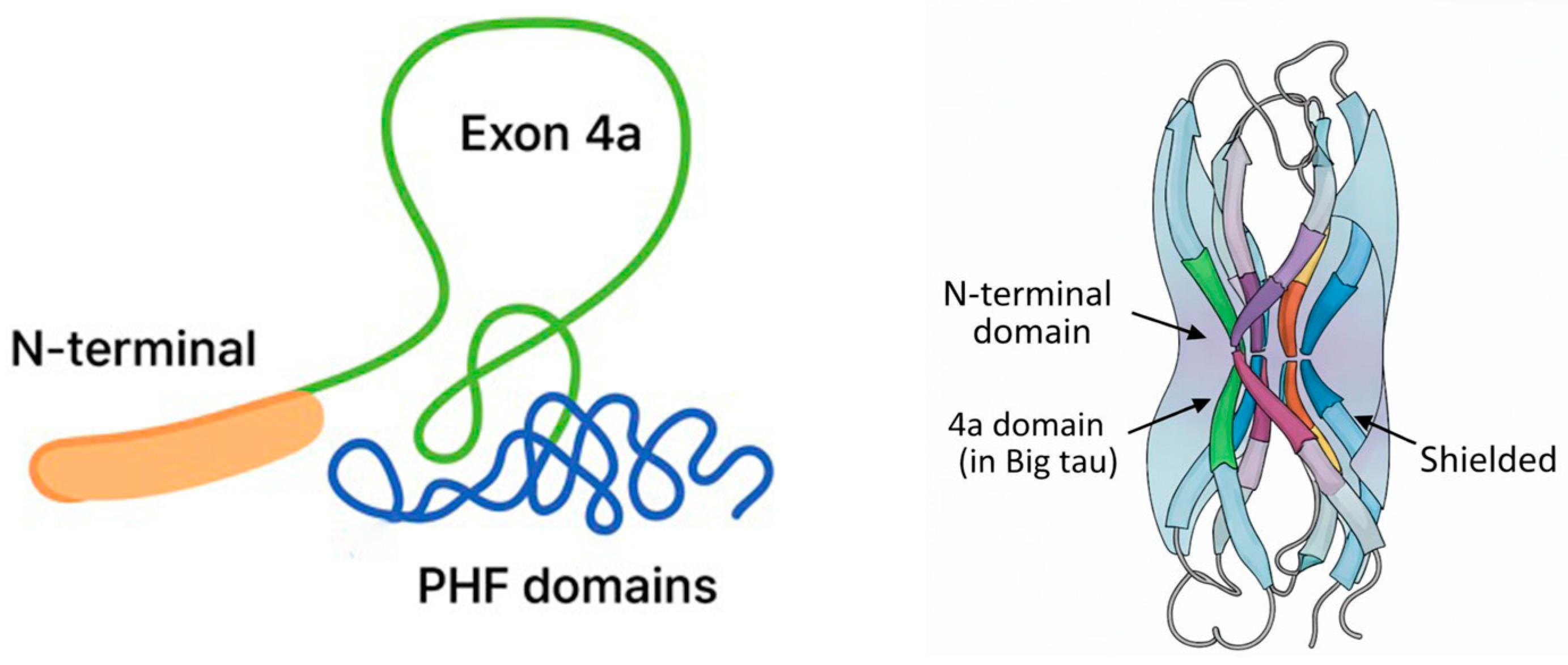 Diagrams of the shielding effects of Big tau. The simplified diagrams illustrate how the Big tau structure can shield the aggregation regions by having a large projection domain that includes the N-terminal and the 4a exon (