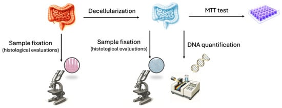 Five intestinal samples (approximately 1.5 m each) from the jejunum of swine weighing approximately 120 kg were collected and transported to the laboratory in sterile cold phosphate-buffered saline (PBS, Sigma-Aldrich, Milan, Italy) supplemented with 2% antibiotic/antimycotic solution (Sigma-Aldrich, Milan, Italy). One intestinal segment (approximately 5 cm in length) from each animal was used to isolate porcine adult intestinal stromal cells. Another fragment of similar length was immediately fixed in 10% buffered formalin to serve as a native tissue control for histological evaluation. The remaining tissue samples were subjected to a decellularization protocol to generate intestinal bio-scaffolds, which were subsequently used for histological analyses, DNA quantification, and 3-(4,5-dimethylthiazol-2-yl)-2,5-diphenyltetrazolium bromide (MTT) assays, as outlined in Figure 1.