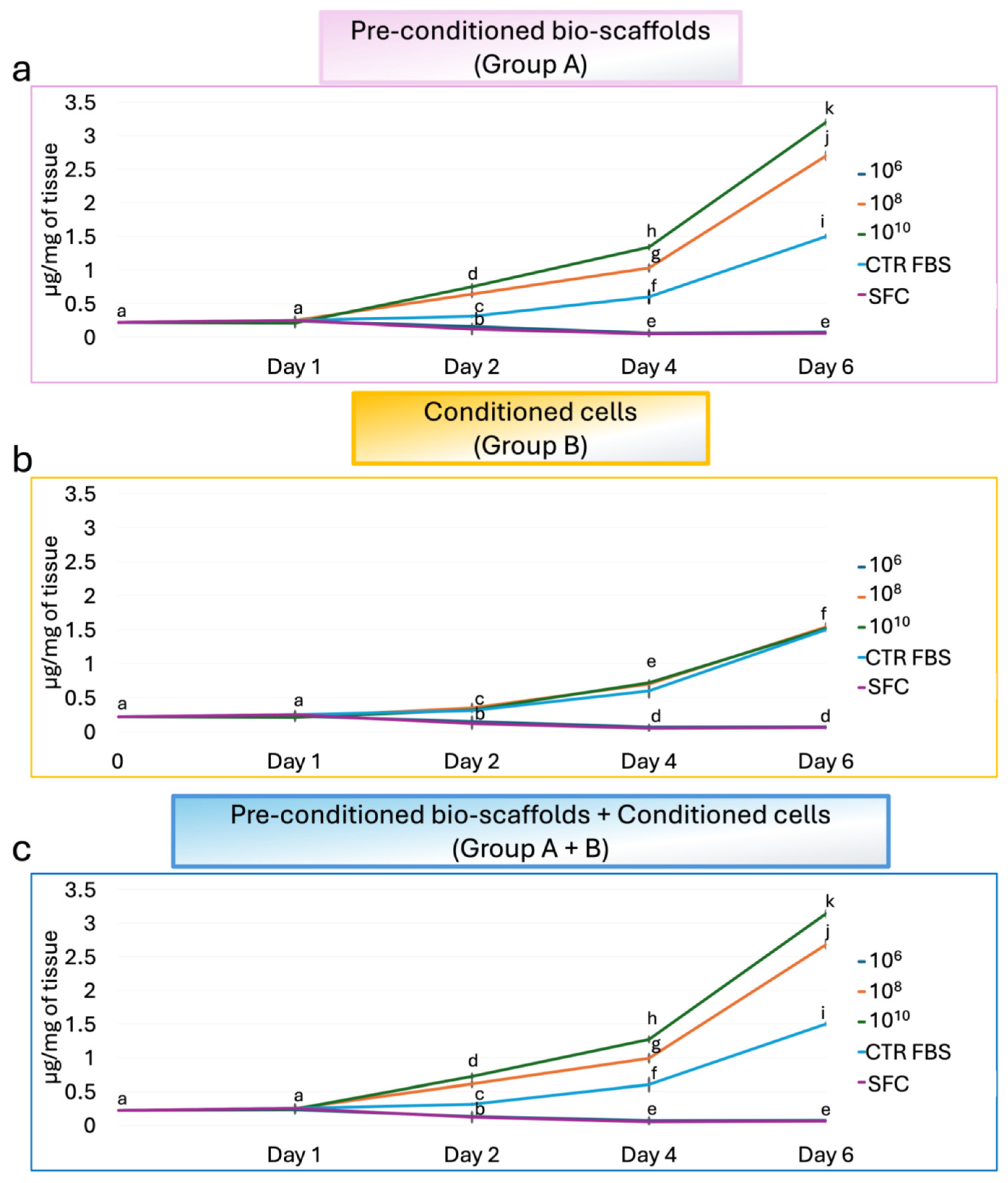 | Pre-conditioned bio-scaffolds + Conditioned cells (Group A+B) | 106 MEVs | 106 MEVs | - |
