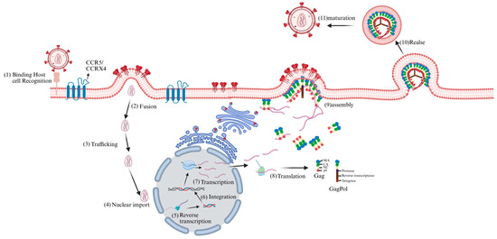 HIV life cycle. The HIV life cycle commences with viral interaction with host cell receptors (1), triggering fusion with the cell membrane and release of the viral core into the host cell cytoplasm (2). Subsequently, the core is transported through the cytoplasm (3), during which reverse transcription and nuclear import begin. At the nuclear pore complex, viral components are transported into the nucleus (4) and localized to transcriptionally active chromatin regions; concurrently, viral core uncoating and reverse transcription continue (5). Integration then occurs (6). Subsequently, viral genes are transcribed (7) and translated (8) into Gag polyprotein precursor, the GagPol polyprotein precursor, the viral envelope glycoproteins, and the regulatory and accessory viral proteins. Under the mediation of the Gag polyprotein, immature virus particles were assembled on the cell membrane (9) and released (10) outside the cell. Subsequently, the viral protease initiated a highly ordered cutting process, ultimately forming mature virus particles (11).