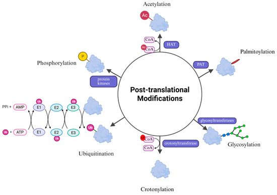 PTMs are crucial for the regulation of protein activity, localization, expression, and interaction with other cellular molecules [23]. This process involves the addition or removal of specific chemical groups to amino acid residues of proteins to alter their function and localization, thus enriching the proteome [24]. This plays a key role in multiple physiological and cellular processes, including cell differentiation [25], protein degradation, signal transduction and regulation, regulation of gene expression, and protein-protein interactions [26]. To date, over 200 PTMs have been identified [27]. These chemical modifications, such as phosphorylation, glycosylation, and ubiquitination, dynamically regulate protein homeostasis and modulate diverse cellular signals in response to environmental changes [28], with wide-ranging implications for research (Figure 2).