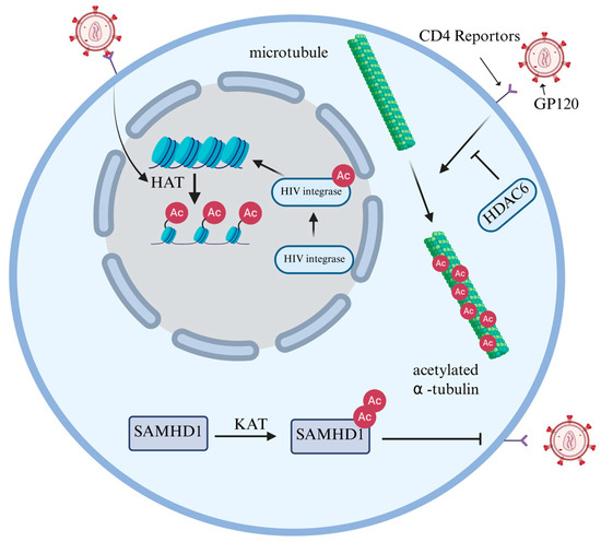 Lysine acetylation is a ubiquitous PTM that is widely present throughout the proteome and helps regulate various cellular functions to maintain homeostasis [31]. It is primarily regulated by two major classes of enzymes: Histone acetyltransferases (HATs) and Histone deacetylases (HDACs) [32]. HATs, including the GCN5 family, p300 family, MYST family and unclassified HATs, catalyze the transfer of acetyl groups to lysine residues [33]. In contrast to HATs, HDACs catalyze the removal of acetyl groups and are categorized into two major classes: Zn2+-dependent classical histone deacetylases and NAD-dependent Sirtuin deacetylases (SIRTs) [34]. Histone acetylation requires the transfer of an acetyl group from acetyl-coenzyme A to the ε-amino group of the lysine side chain within the substrate [35]. This reduces the positive charge on histones, diminishing their affinity for negatively charged DNA, thus leading to a relaxation of the nucleosome structure. Consequently, this facilitates the specific binding of various transcription factors to DNA binding sites and activates gene transcription [36]. Regulating histone acetylation constitutes a crucial pathway for HIV to achieve its own transcription and replication goals within the host. The binding of GP120 protein to CD4+ induces the formation of acetylated α-tubulin, which contributes to the stability of microtubules, thereby promoting HIV infection [37]. Conversely, it was found that HDAC6 can counteract the acetylation of tubulin, thereby inhibiting HIV infection [38]. Furthermore, acetylation can also modify integrase (IN) to increase its affinity for DNA and enhance its ability to transfer DNA strands [20] (Figure 3).