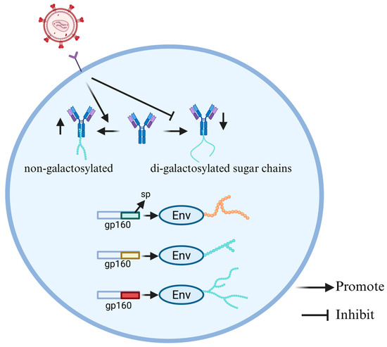 HIV-associated alterations in glycosylation patterns of Env and IgG. The different sps in the precursor protein gp160 of the envelope protein can cause different glycosylation of Env. HIV infection leads to a greater number of non-galactosylated and fewer di-galactosylated sugar chains in the IgG glycosylation pattern.