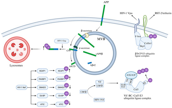 - Gu, F.; Boisjoli, M.; Naghavi, M.H. HIV-1 promotes ubiquitination of the amyloidogenic C-terminal fragment of APP to support viral replication. Nat. Commun. 2023, 14, 4227. [Google Scholar] [CrossRef]