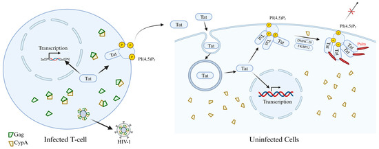 The HIV-1 Tat protein is precisely regulated by palmitoylation, which determines its subcellular localization and profoundly affects viral replication and transmission, as well as the underlying pathogenic mechanisms. Most HIV-1 Tat is unconventionally secreted by infected cells after interacting with phosphatidylinositol (4,5) bisphosphate (PI(4,5)P2) on the plasma membrane. Chopard et al. [106] revealed the mechanism by which the intracellular localization and function of Tat are regulated through protein palmitoylation during infection, thus affecting viral pathogenicity. Research has found that the Tat protein does not undergo palmitoylation in infected cells but is secreted efficiently. However, when secreted Tat reaches neighboring uninfected cells, it can be palmitoylated at the Cys31 site by S-acyltransferase DHHC-20. This modification depends on the binding of Tat to PI(4,5)P2 and is assisted by two prolyl isomerases, cyclophilin A (CypA) and FKBP12. Palmitoylation significantly enhances the affinity of Tat for PI(4,5)P2, enabling it to stably target the cell membrane, thereby inhibiting its secretion and increasing its accumulation within the cell. Functionally, palmitoylated Tat disrupts PI(4,5)P2-dependent membrane transport processes, such as phagocytosis in macrophages and secretory activities in neurons. Further research revealed that the viral Gag protein binds to CypA and incorporates it into viral particles, depleting CypA within infected cells. This inhibits Tat palmitoylation and promotes its secretion (Figure 7). This mechanism ensures that the virus retains Tat during early infection to enhance transcription, while promoting its secretion in the later stages to influence neighboring uninfected cells [106]. This discovery not only deepens our understanding of the pathogenic mechanisms of HIV-1 but also provides a theoretical basis for the development of novel antiviral strategies targeting Tat palmitoylation or its interaction with PI(4,5)P2.