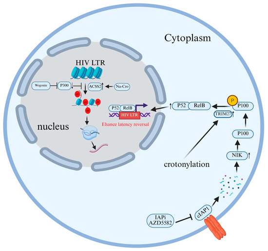 Targeting crotonylation has been confirmed as a viable strategy to promote the latency reversal of HIV induced by the inhibitor of apoptosis (IAP)-inhibiting small molecule (IAPi) AZD5582, and its mechanism involves promoting the activation of the non-canonical NF-κB signaling pathway via TRIM27. Li et al. [117] induced crotonylation by adding sodium crotonate (NaCr) to cultured cells and combined it with IAPi (AZD5582) treatment. They found that crotonylation could significantly enhance the HIV latency reversal effect of AZD5582, which manifested as higher viral RNA expression levels and more green fluorescent protein (GFP)-positive cells, which was used as an indicator of HIV transcriptional activity. In addition, the study also found that crotonylation promoted the activation of the ncNF-κB signaling pathway by enhancing the cleavage of p100 to yield p52, which may involve the E3 ubiquitin ligase TRIM27. In addition, the results of siRNA knockdown experiments indicated that the deletion of TRIM27 would reduce p100/p52 levels and inhibit the reversal of HIV latency [117] (Figure 8).