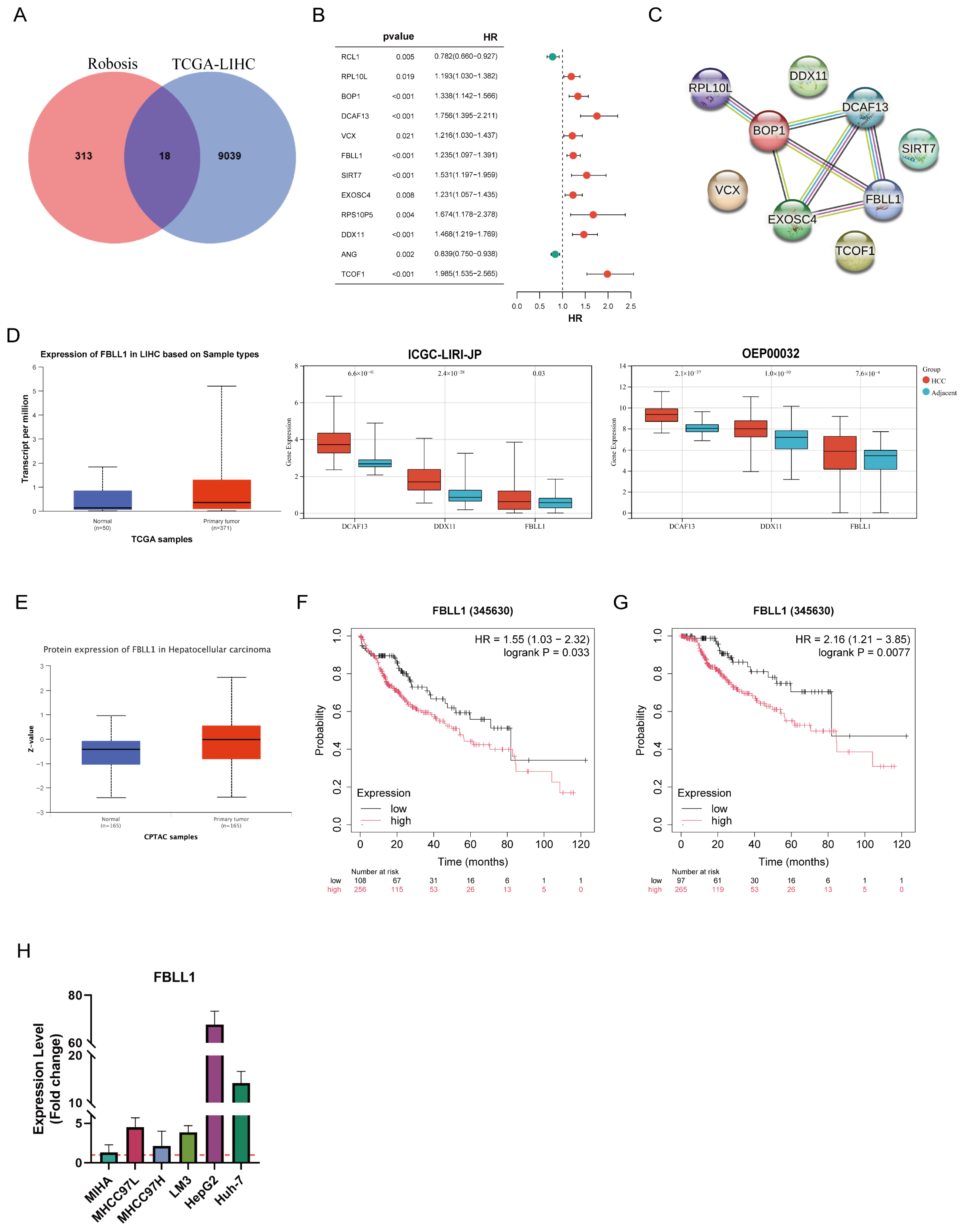 External datasets (ICGC-LIRI-JP, OEP000321 and CPTAC) confirmed that FBLL1 was significantly increased in tumor tissues compared to normal tissues (