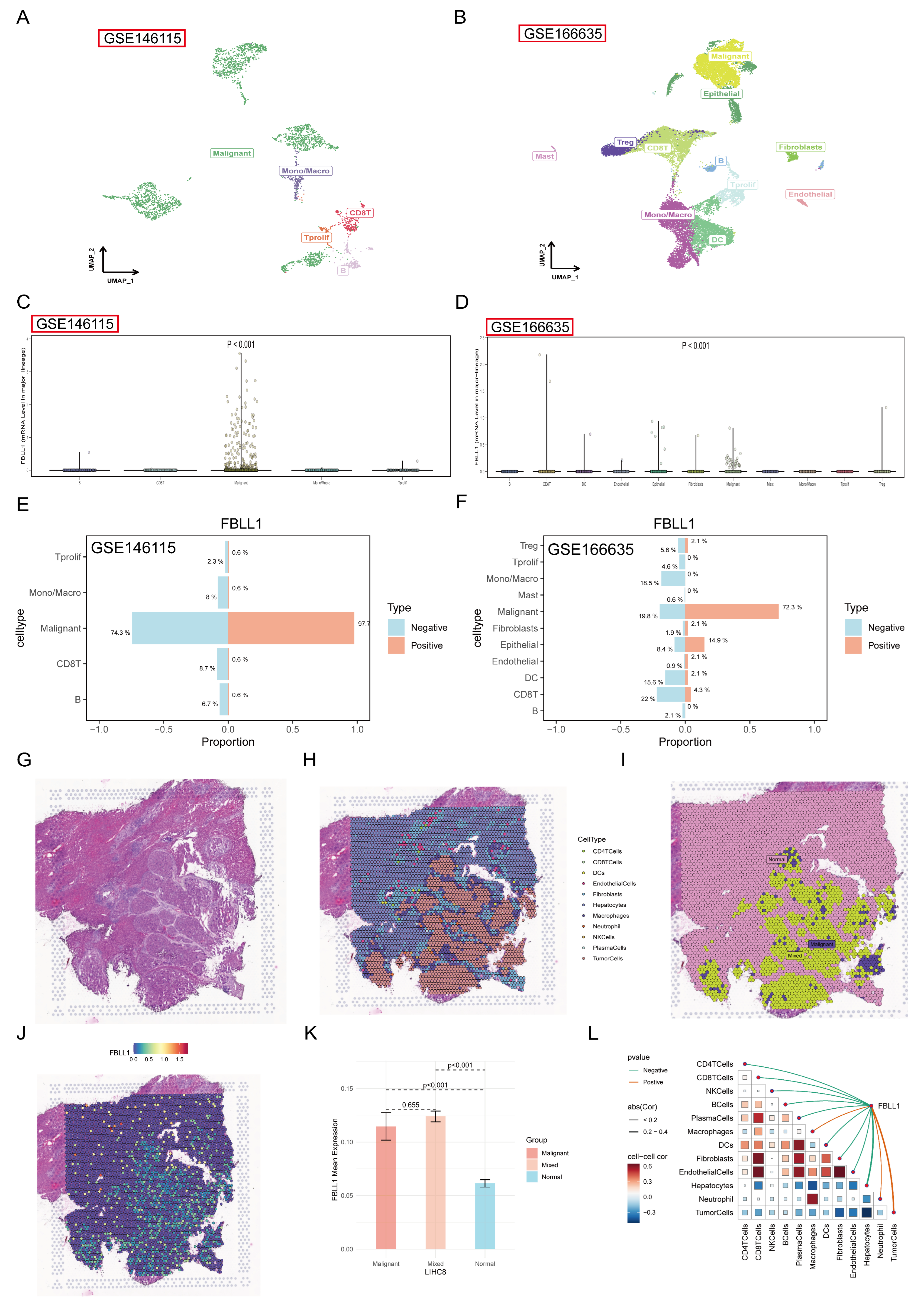 Figure 2J). Quantitative analyses showed that the average FBLL1 expression level was significantly higher in malignant regions than in adjacent normal regions, and FBLL1 expression was positively correlated with the proportion of tumor cells in each spatial spot (