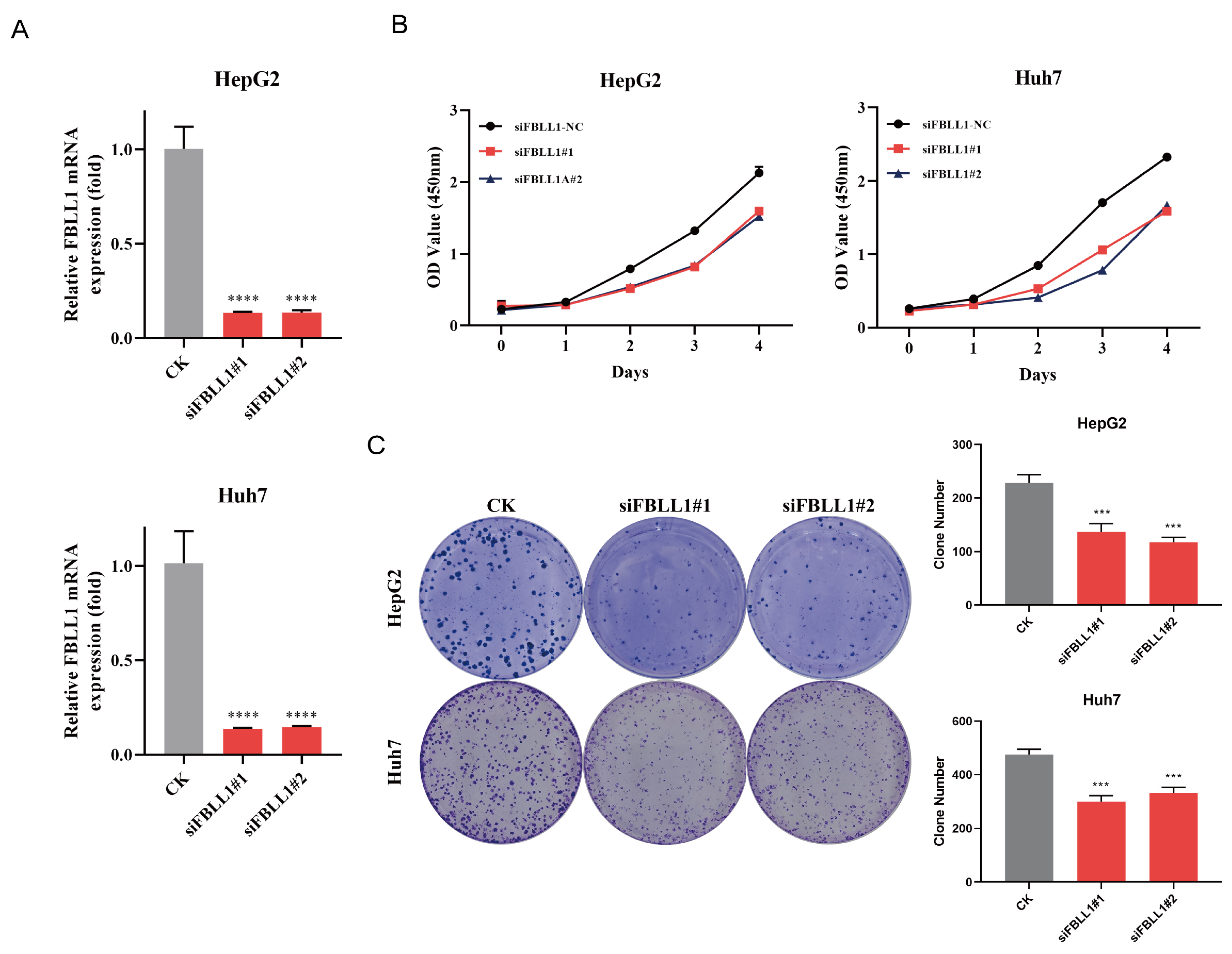 To investigate the functional requirement of FBLL1 in HCC, siRNA-mediated knockdown was performed in HepG2 and Huh7 cells. Owing to the absence of commercially available antibodies for detecting endogenous FBLL1, silencing efficiency was validated at the mRNA level by qRT-PCR (
