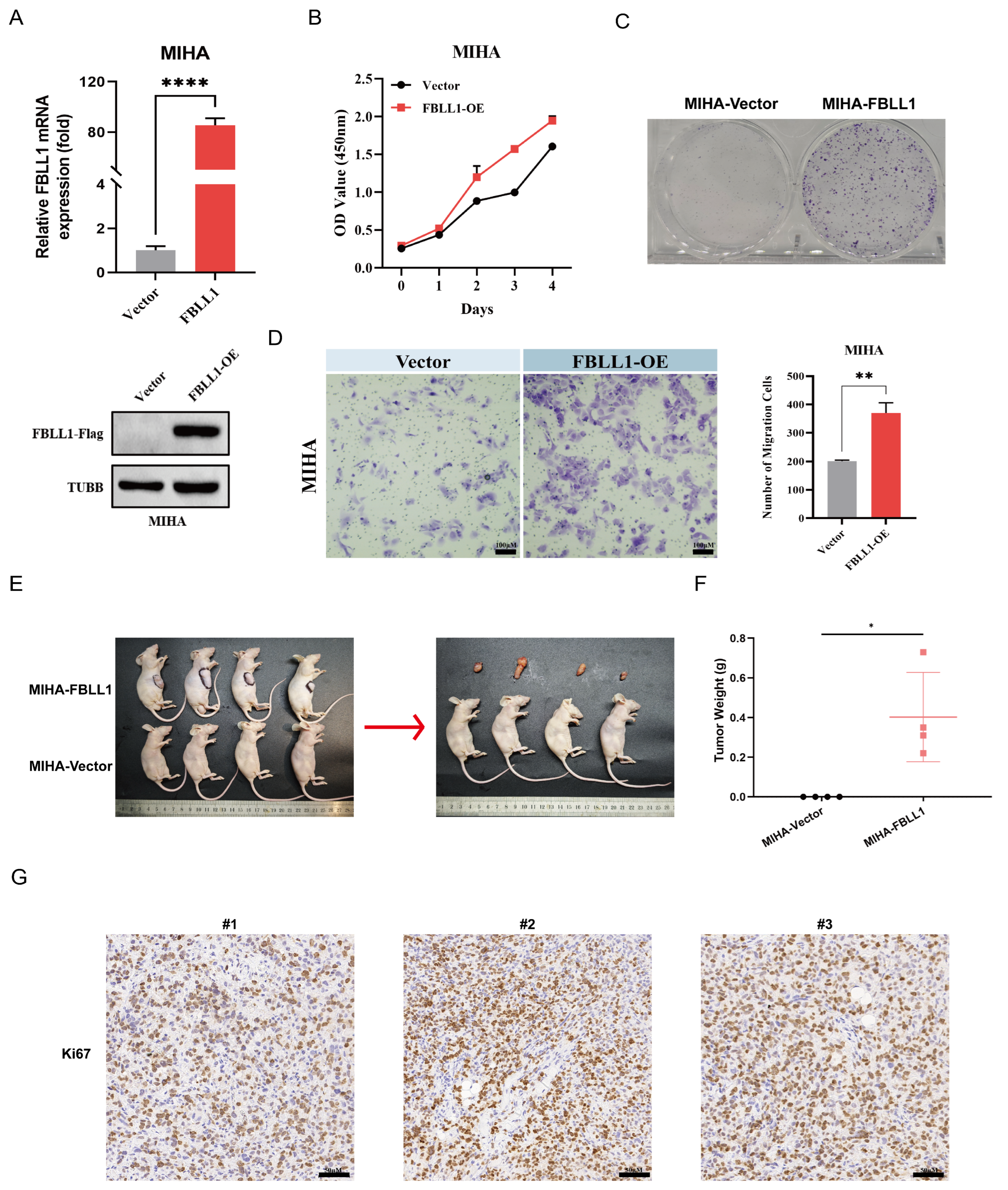 Figure 4D) of MIHA cells. Furthermore, MIHA-Vector and MIHA-FBLL1 cells were subcutaneously injected into nude mice. While MIHA cells failed to form tumors, FBLL1-overexpressing group generated palpable xenograft tumors (
