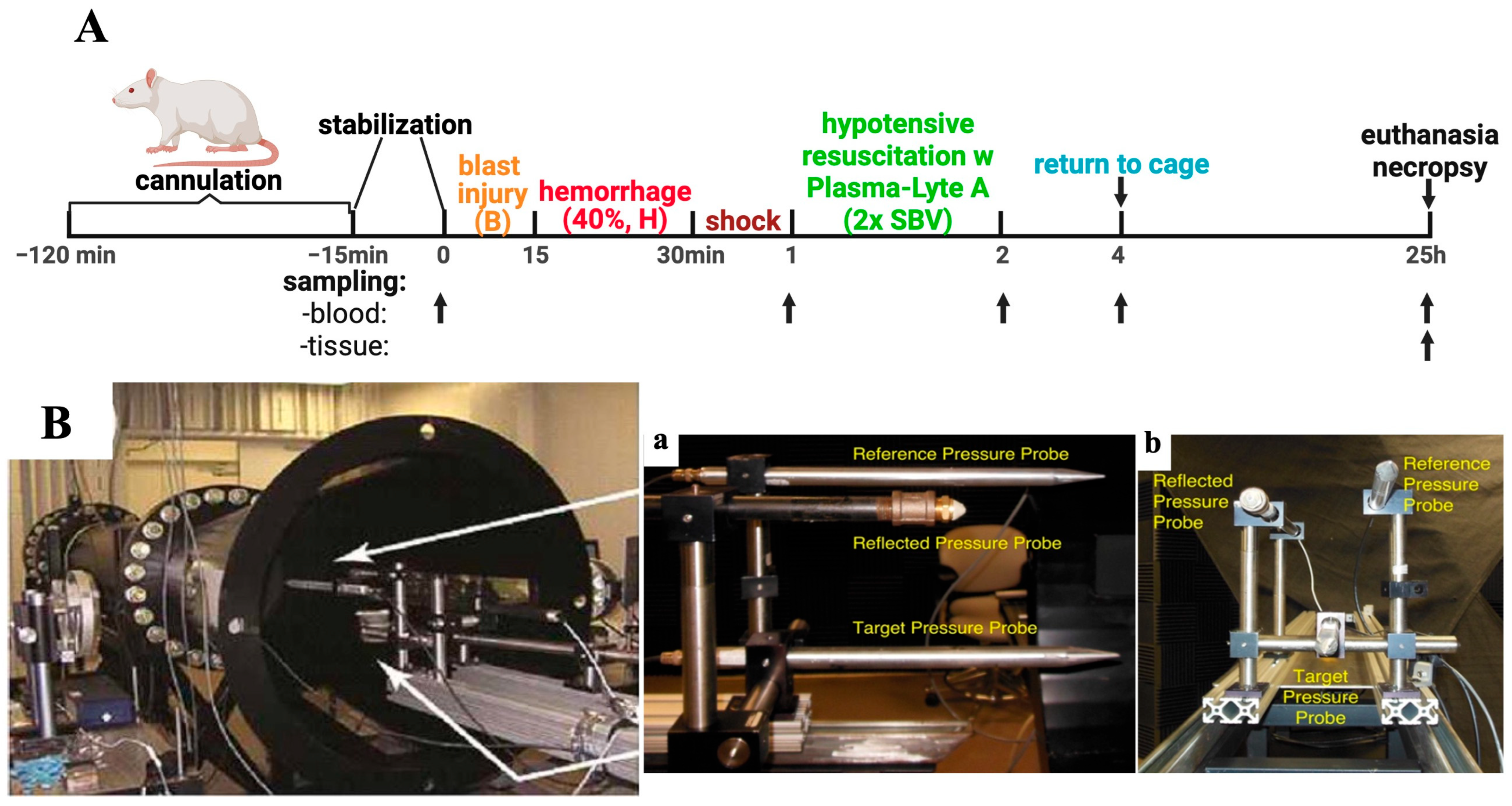 - Simovic, M.O.; Yang, Z.; Jordan, B.S.; Fraker, T.L.; Cancio, T.S.; Lucas, M.L.; Cancio, L.C.; Li, Y. Immunopathological Alterations after Blast Injury and Hemorrhage in a Swine Model of Prolonged Damage Control Resuscitation. Int. J. Mol. Sci. 2023, 24, 7494. [Google Scholar] [CrossRef]