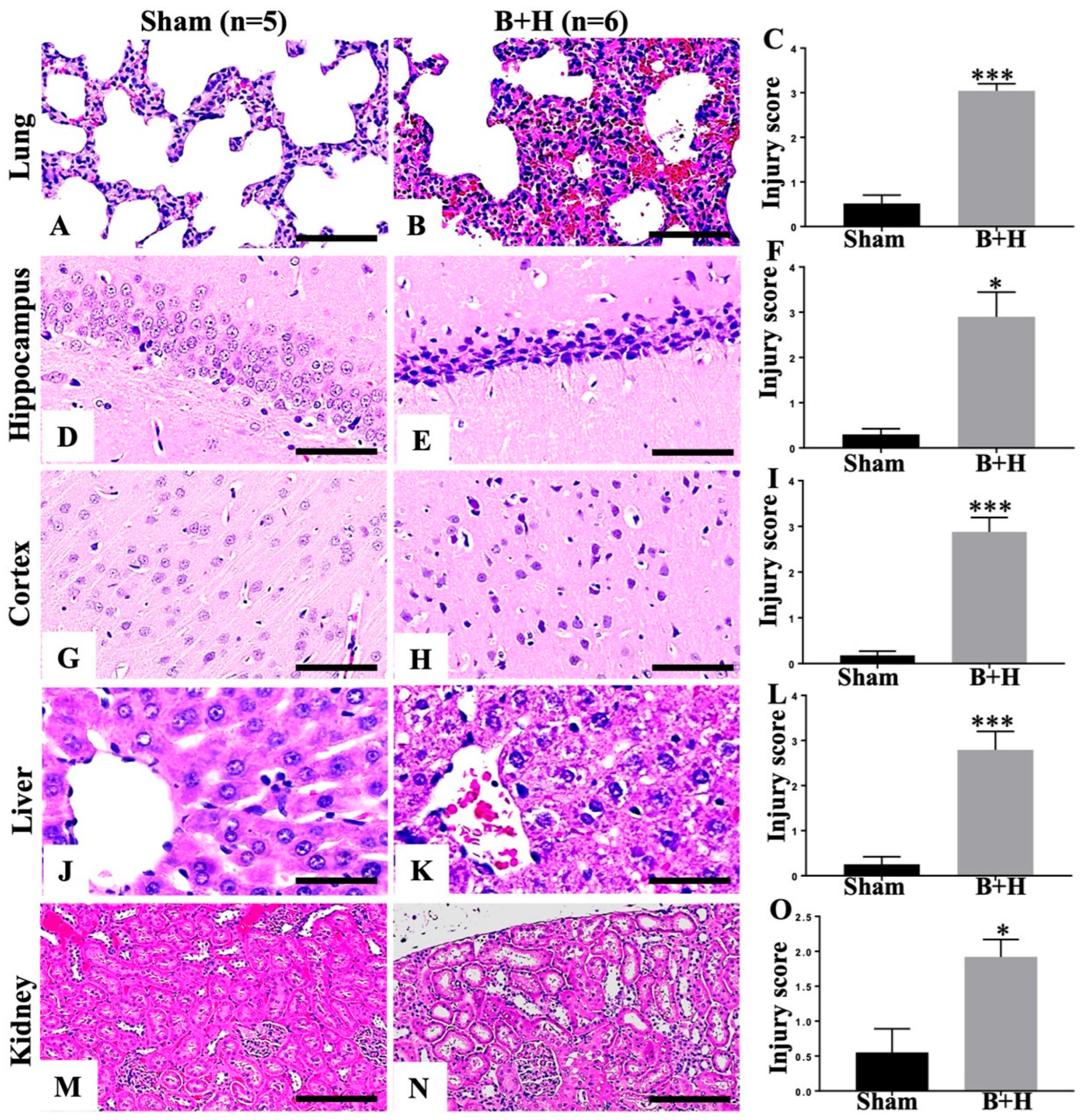 2.3. Histological Examination and Tissue Injury Scoring