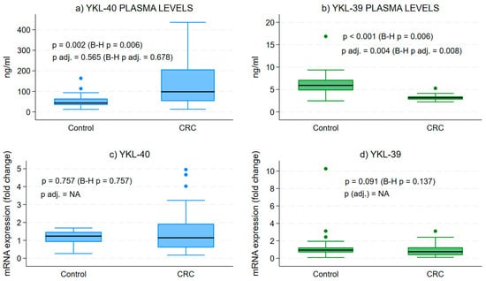 Protein and gene expression levels of YKL-40 and YKL-39 in blood samples. Difference in the median secretory plasma circulating forms of YKL-40 and YKL-39 in CRC and in healthy patients. Medians across groups are compared using Mood’s median test and quantile regressions, with the latter adjusting for age and sex. Analytical sample size: N = 64 in (panel a), from which n = 32 CRC and n = 32 control samples; N = 53 in (panel b), from which n = 29 CRC and n = 24 control samples; N = 52 in (panel c), from which n = 32 CRC and n = 20 control samples; and N = 59 in (panel d), from which n = 32 CRC and n = 27 control samples; p—p value from bivariate median test, p adj.—p-value from quantile regression, B-H p/p adj.—Benjamini–Hochberg corrected version of the median test or quantile regression-associated p value, NA—quantile regression effect estimates for CRC vs. control group could not be estimated due to collinearity in the models.