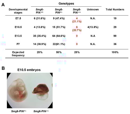3.3. The Smg6-PINΔ/Δ Mouse Is Embryonic Lethal