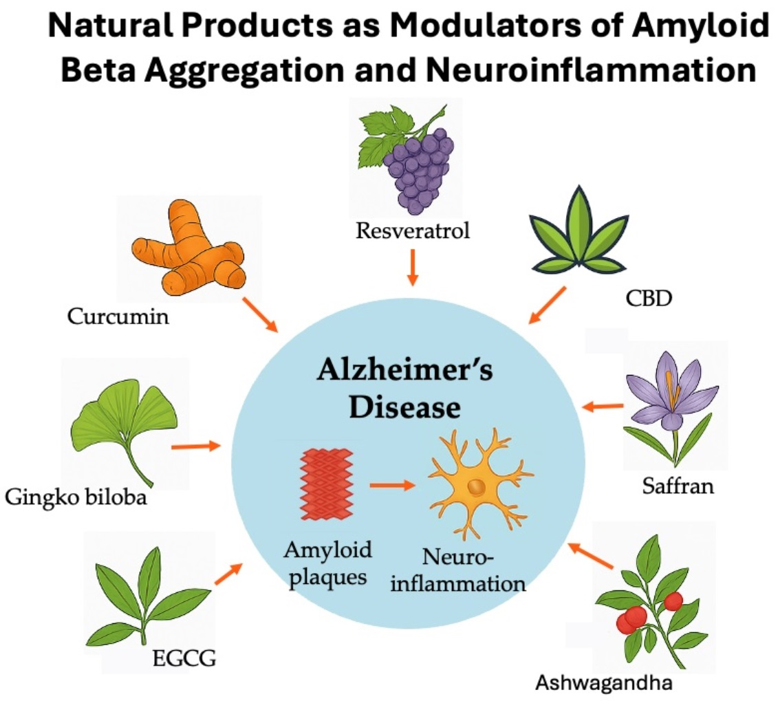 Study Design and Search Strategy: This review was performed by a comprehensive literature search using PubMed, Web of Science, and Scopus as electronic databases. The search strategy targeted studies published up to July 2025, with a specific focus on recent advancements in nanomedicine between 2020 and 2025 to ensure the inclusion of the most current therapeutic trends. As search keywords were used combinations of: “Alzheimer’s disease,” “Amyloid beta aggregation,” “Neuroinflammation,” “NLRP3 inflammasome,” “Natural products,” “Curcumin,” “Resveratrol,” “EGCG,” “Saffron,” “Ashwagandha,” “Cannabidiol,” and “Nanomedicine/Nanoparticles”.