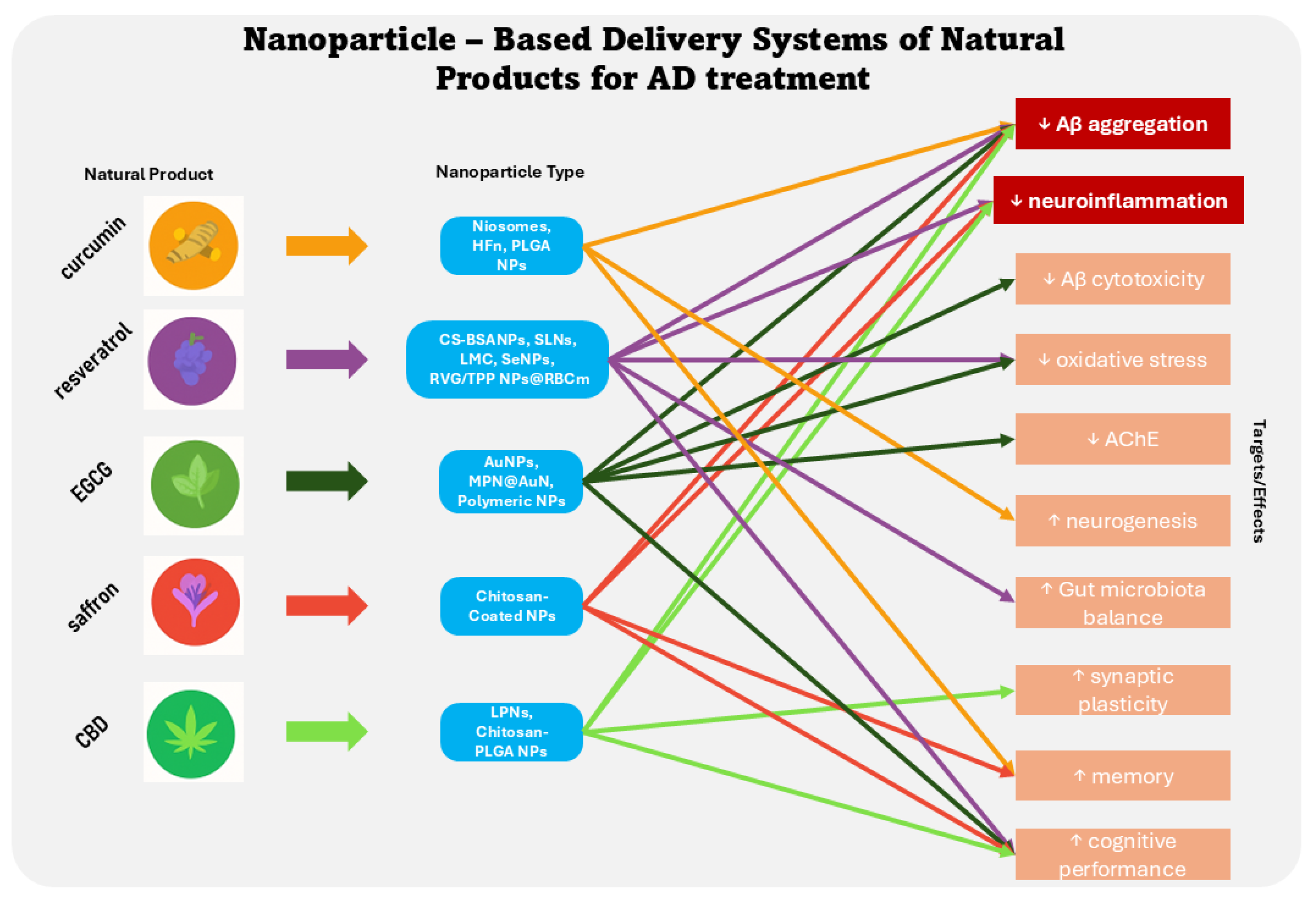 Second, the literature on natural products and nanoparticle-based delivery systems in AD remains heterogeneous and, in many cases, preliminary. On the other hand, as a review, it focuses on selected high-potential bioactive compounds and may be subject to selection bias, not incorporating the entire pharmacopeia of neuroprotective agents. Furthermore, a significant heterogeneity exists across the included studies with regard to the extraction methods, purity, and dosage of the natural products. Finally, while nanotechnology offers a solution to bioavailability issues, data concerning the long-term safety, biodegradability, and potential toxicity of these nanocarriers in the human brain remain insufficient, highlighting a critical gap that requires toxicological evaluation in future research. Consequently, conclusions regarding the potential therapeutic potential should be interpreted with caution.
