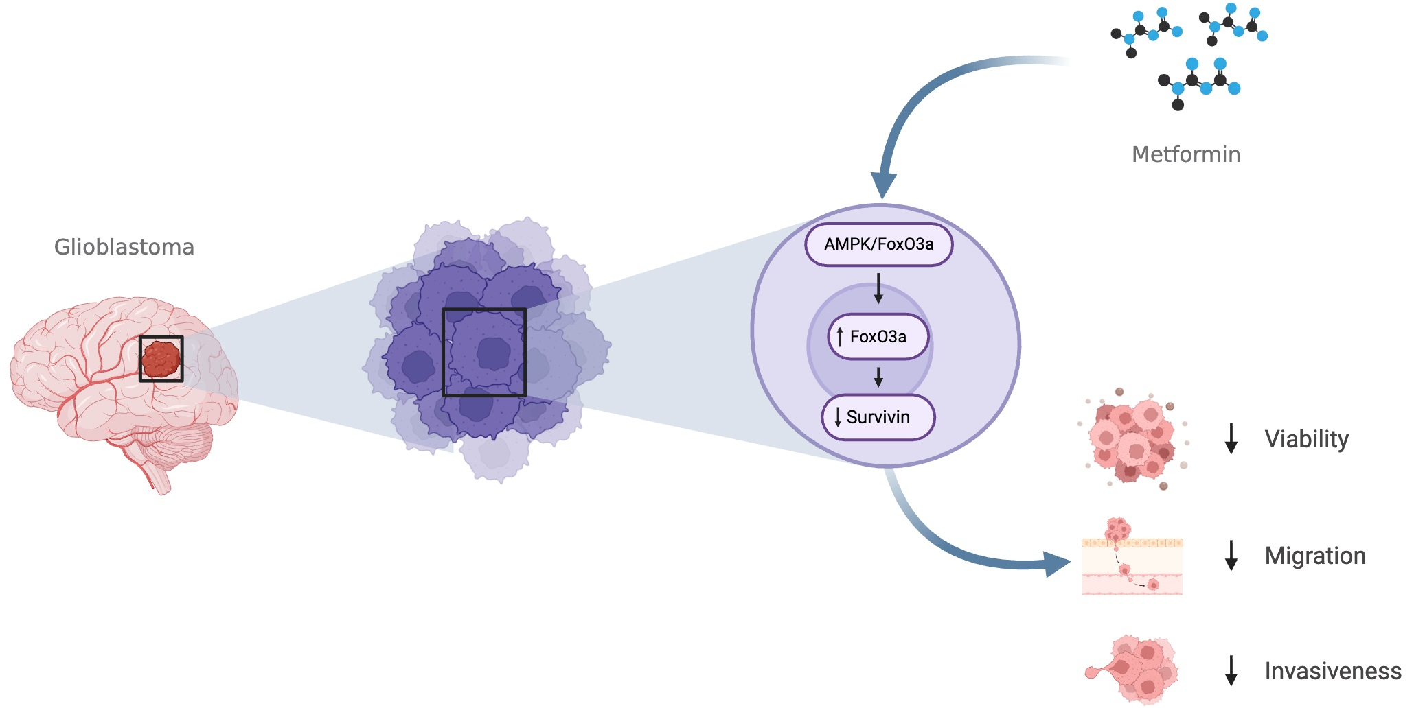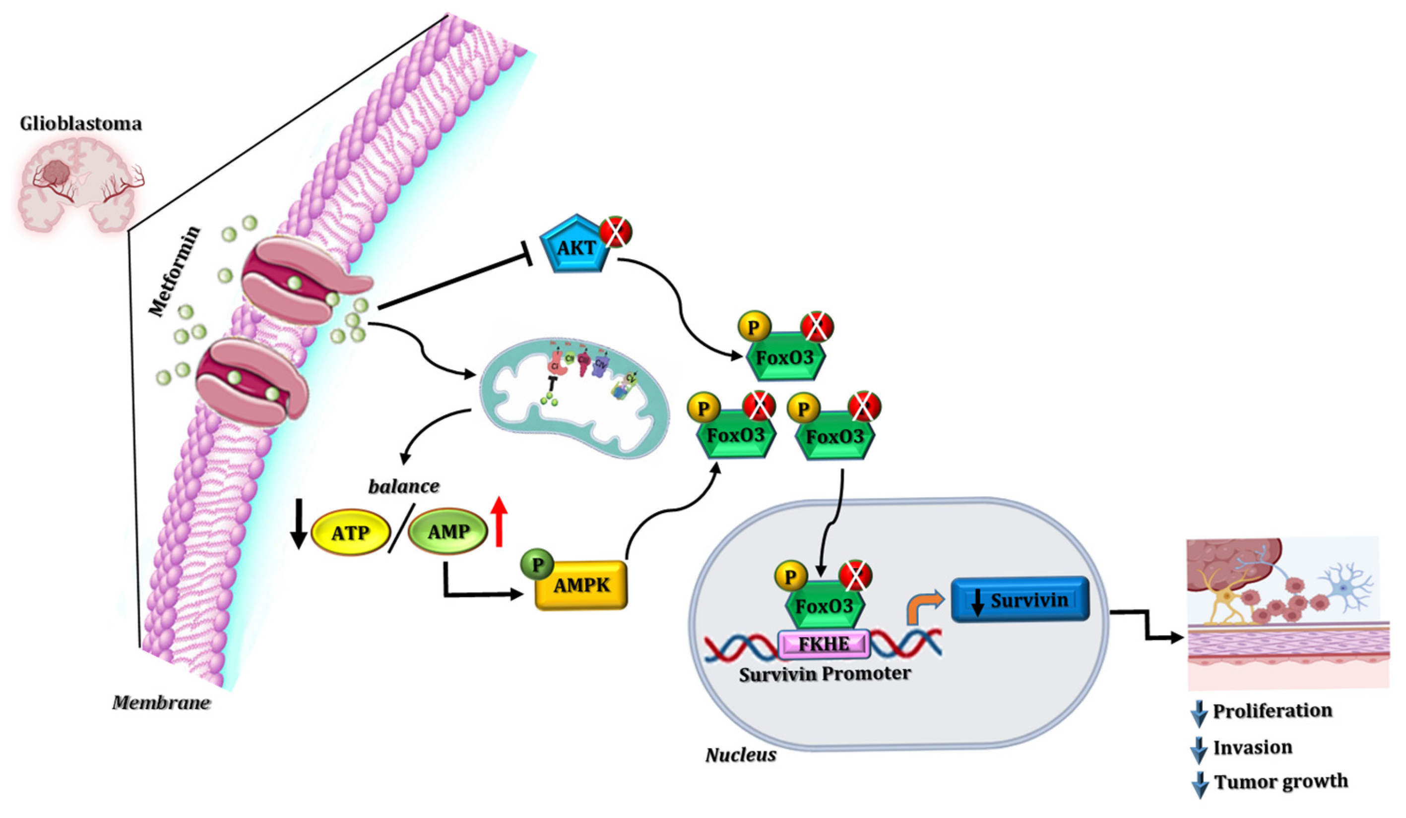 Cavaliere, F.; Pellegrino, M.; Cormace, A.; Spadafora, S.; Fava, M.; Yang, S.H.; Lee, J.E.; Nocito, M.C.; Sirianni, R.; Casaburi, I.; et al. Metformin Suppresses Glioblastoma Tumor Growth and Progression Through the AMPK/FoxO3a/Survivin Axis. Cells 2026, 15, 310. https://doi.org/10.3390/cells15030310