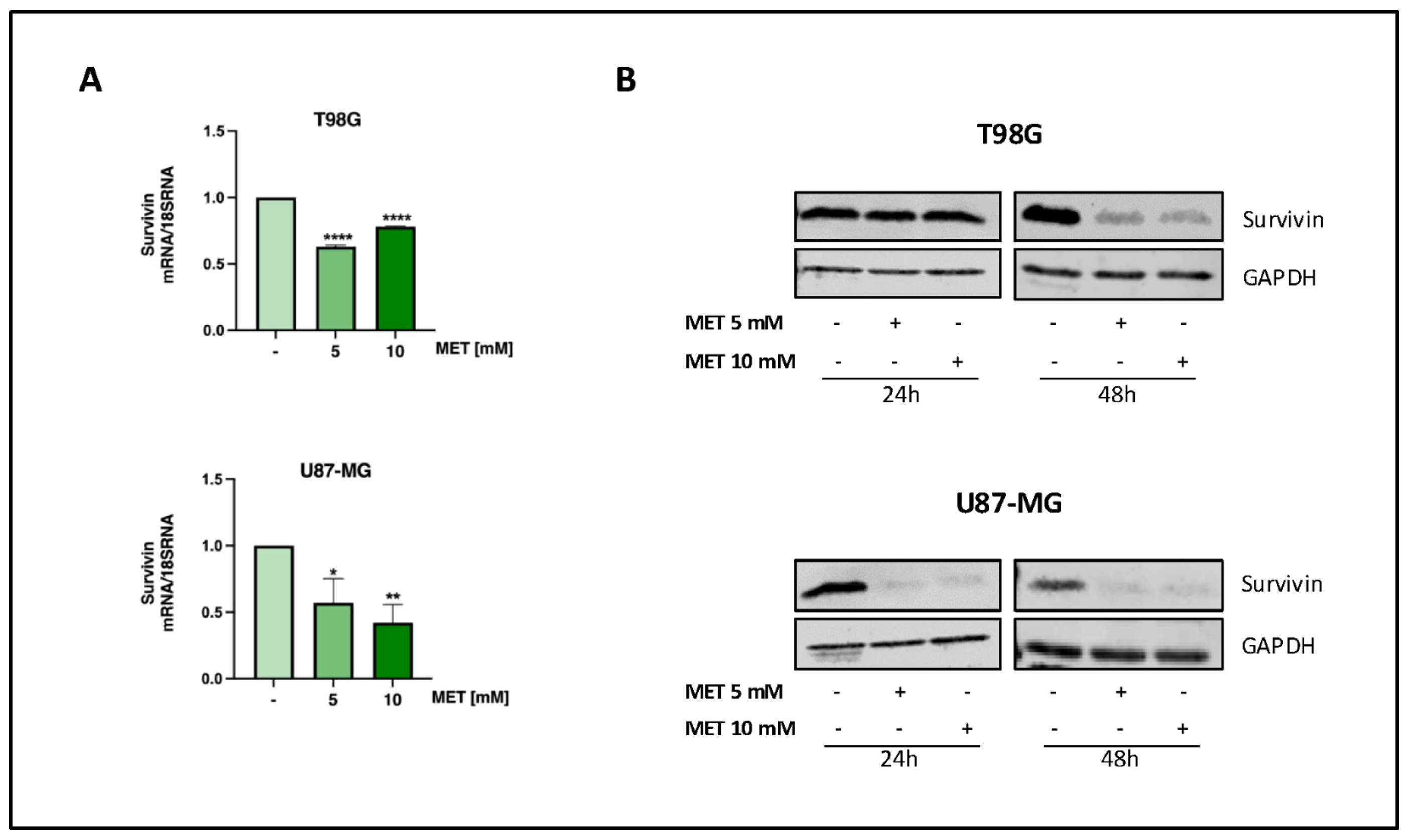 - Tong, X.; Yang, P.; Wang, K.; Liu, Y.; Liu, X.; Shan, X.; Huang, R.; Zhang, K.; Wang, J. Survivin is a prognostic indicator in glioblastoma and may be a target of microRNA-218. Oncol. Lett. 2019, 18, 359–367. [Google Scholar] [CrossRef]