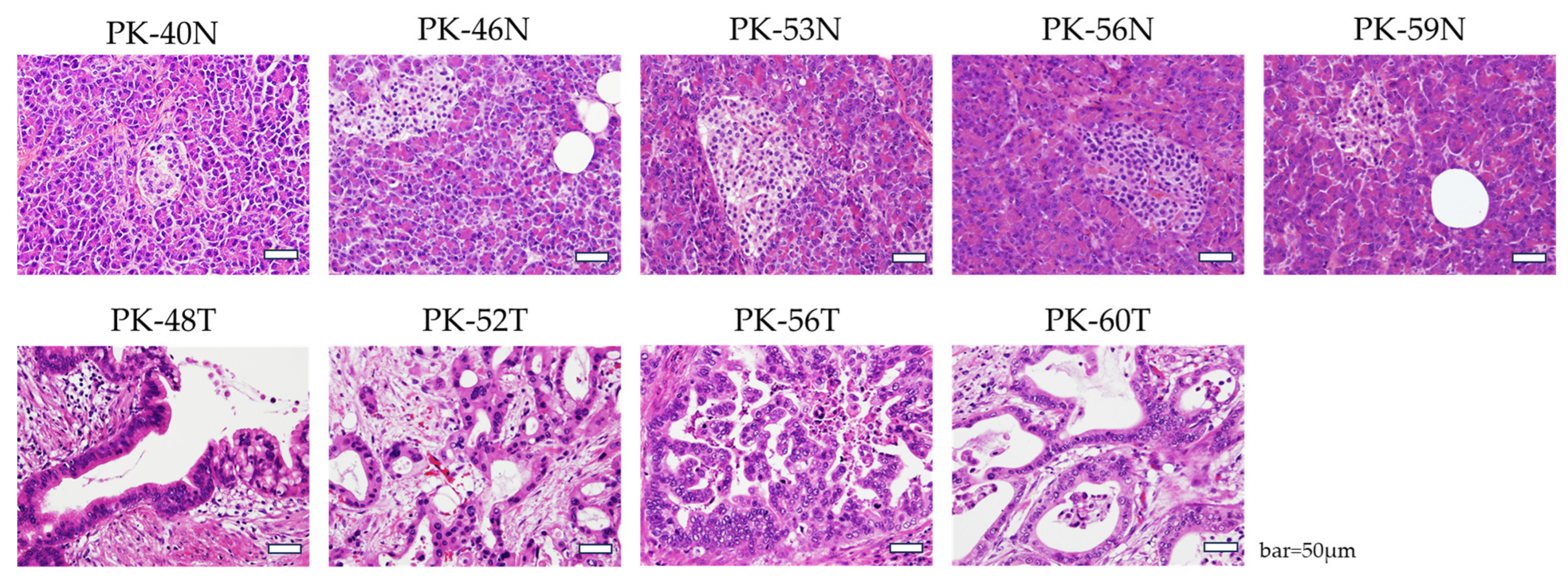 Figure 1). N sections showed well-organized acinar structures and islets of Langerhans, consistent with normal pancreatic morphology. T sections showed characteristic features of PDAC, including irregular ductal structures composed of atypical cells and prominent desmoplastic stroma. These findings confirmed the identity and purity of tissues used for subsequent primary cell culture and molecular analyses.