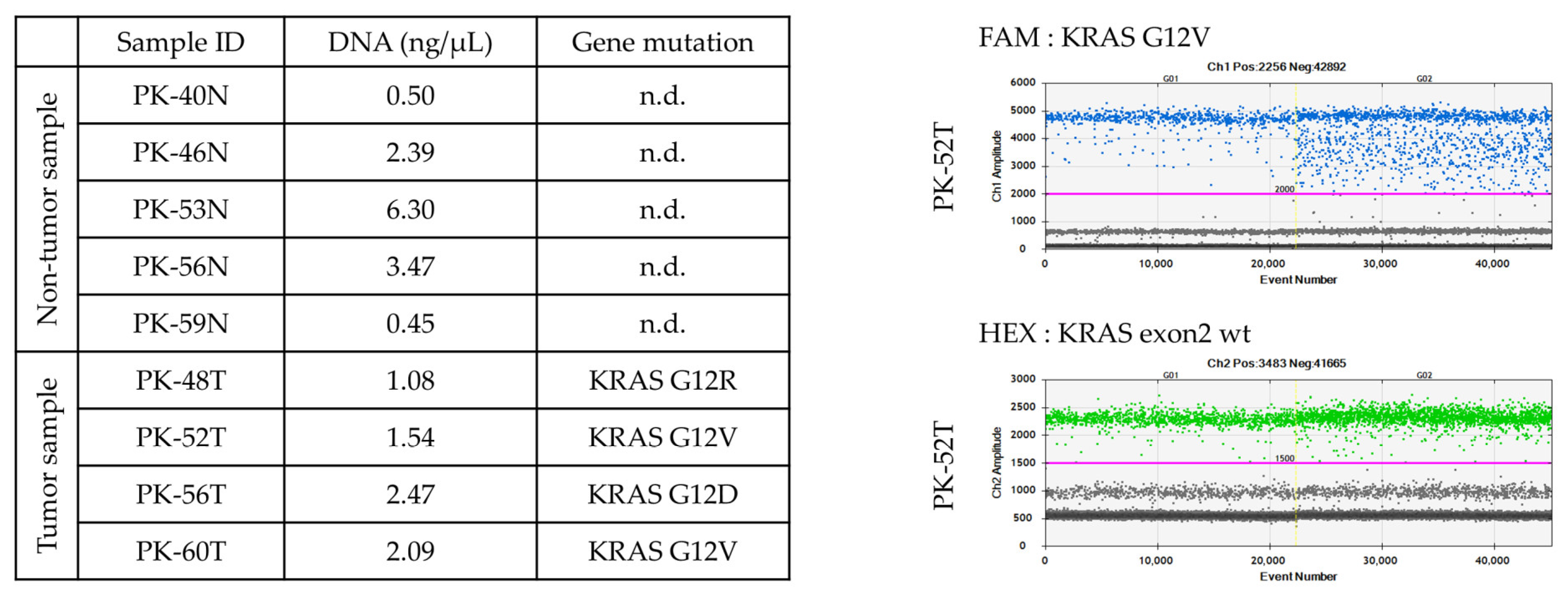 2O. The ddPCR reaction for KRAS G12D had a total volume of 25 µL, comprising ddPCR Supermix for Probes, ddPCR Mutation Assay: KRAS p.G12D (#1863506, Multiplex Mutation Screening Kits, Bio-Rad Laboratories), and 5 µL DNA template, with the reaction brought to final volume using ddH