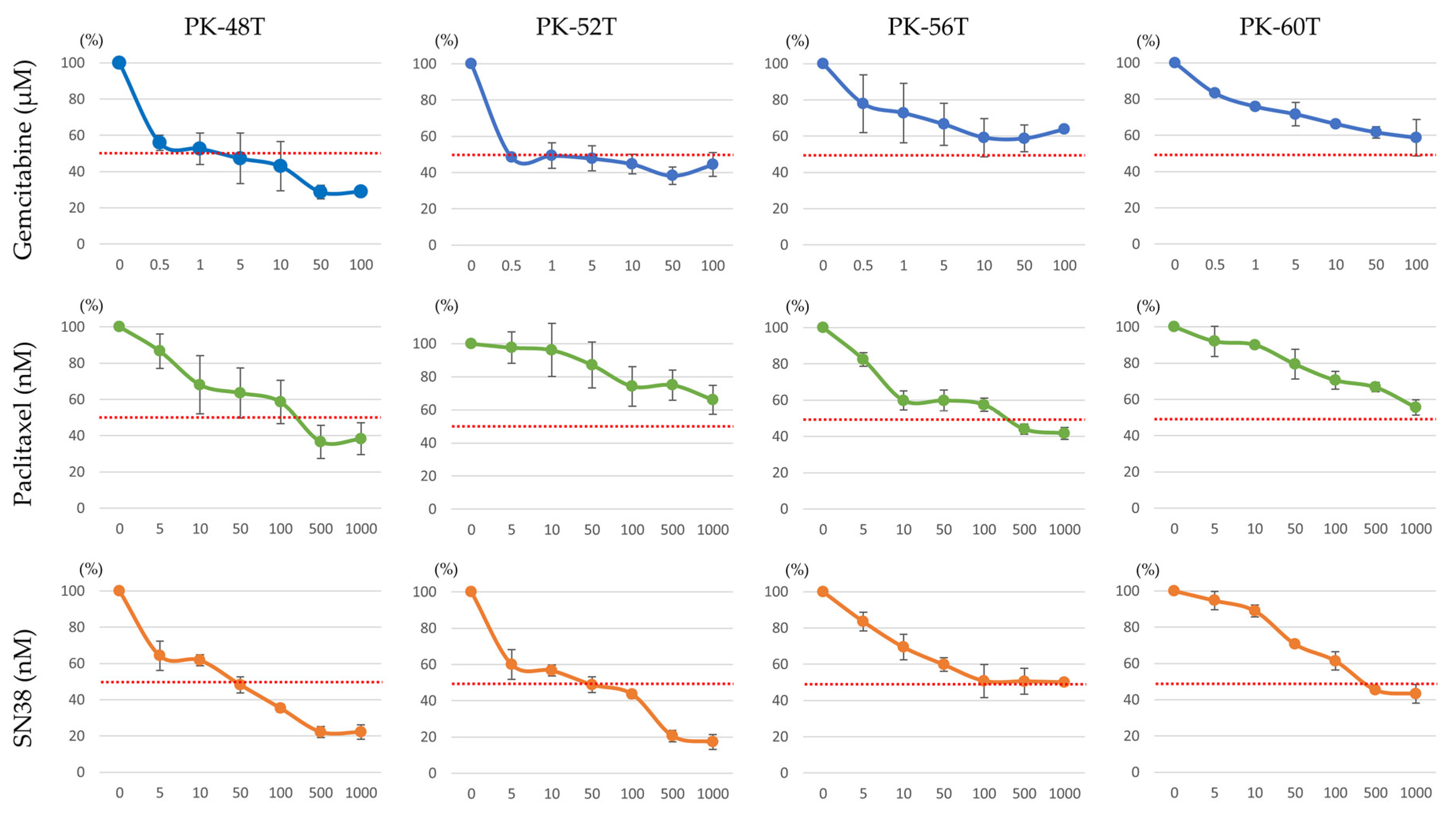 We evaluated the chemosensitivity of the established primary cells to standard chemotherapeutic agents, including gemcitabine, paclitaxel, and SN38 (