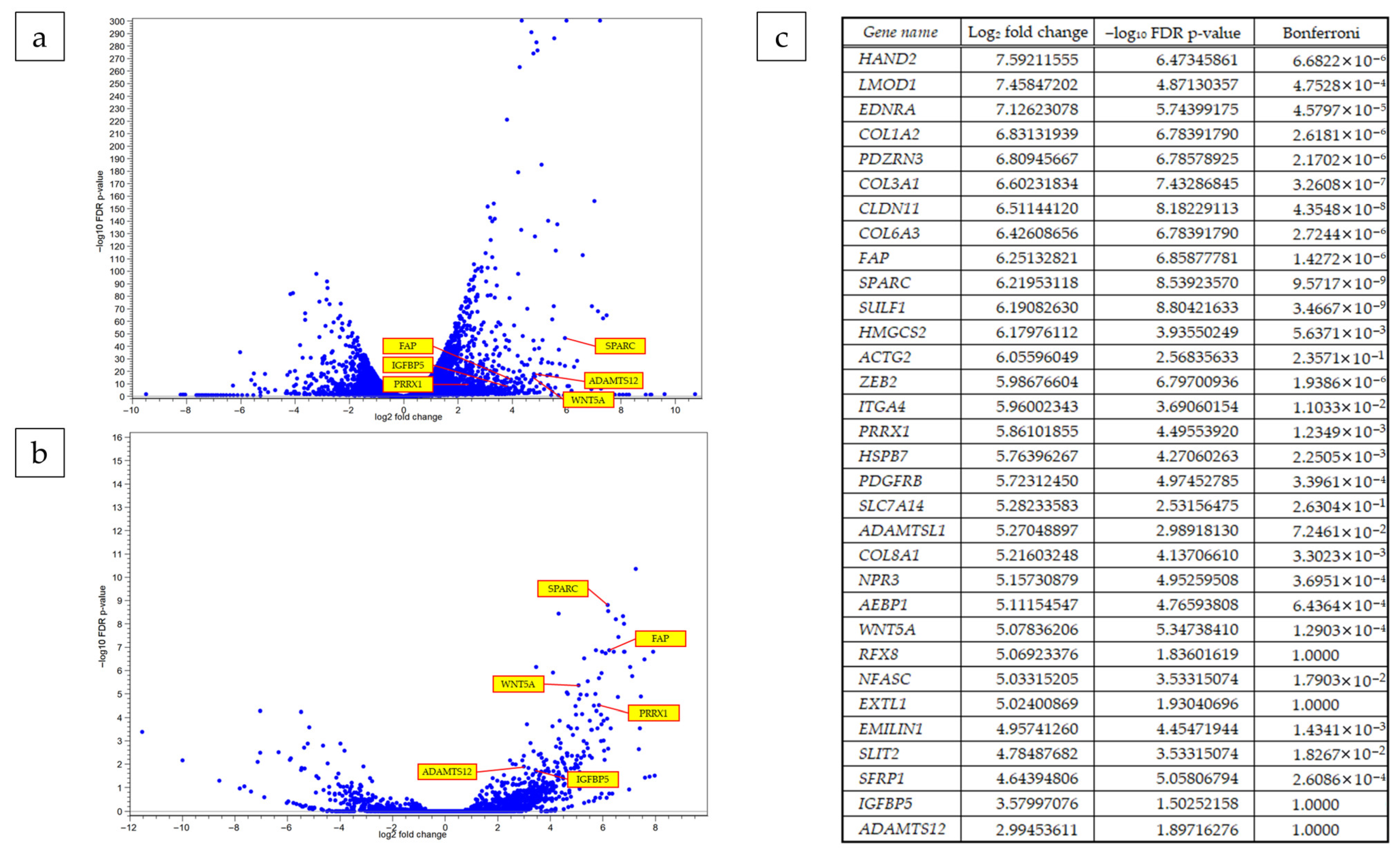 To validate the reliability of our RNA-seq findings, we performed qRT-PCR on six representative genes: FAP, IGFBP5, PRRX1, SPARC, WNT5A, and ADAMTS12.