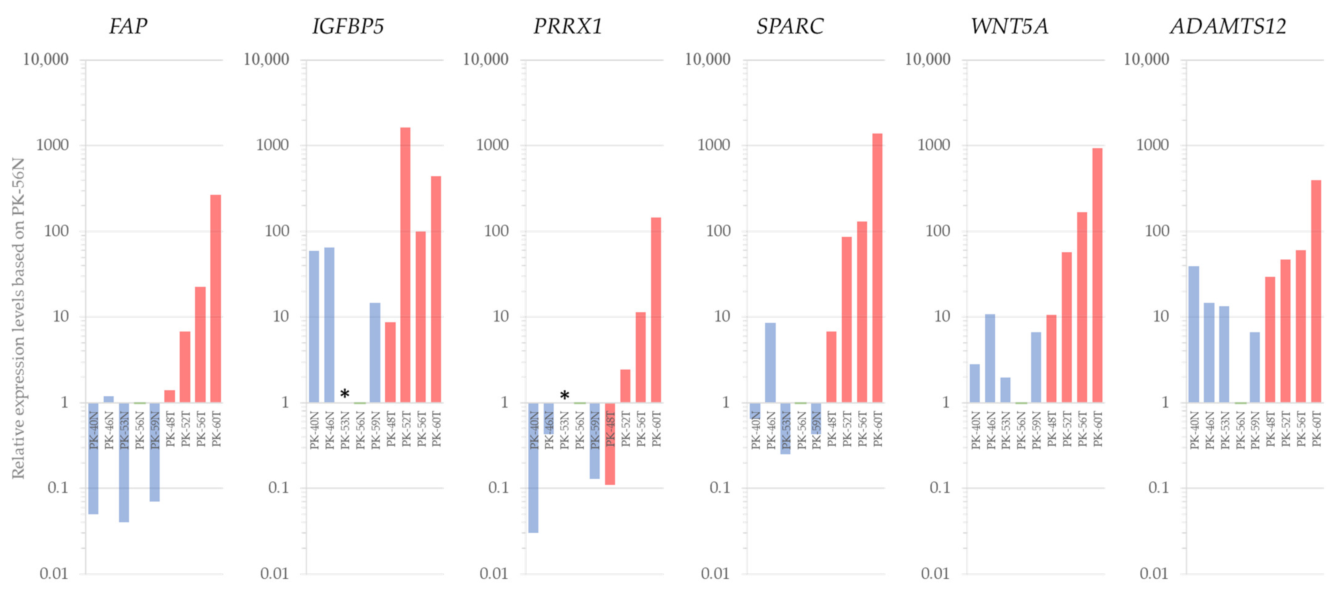 FAP exhibited a highly specific expression pattern, with near-negligible levels in all N samples and robust upregulation across the tumor cases. This distinct expression profile suggests that FAP serves as a particularly potent candidate marker for discriminating between T and N phenotypes in our patient-derived models. Furthermore, genes associated with extracellular matrix remodeling and oncogenic signaling, such as SPARC and WNT5A, showed significant fold-changes relative to the PK-56N baseline. These results reinforce the technical accuracy of our sequencing pipeline and the biological relevance of the identified gene signatures.