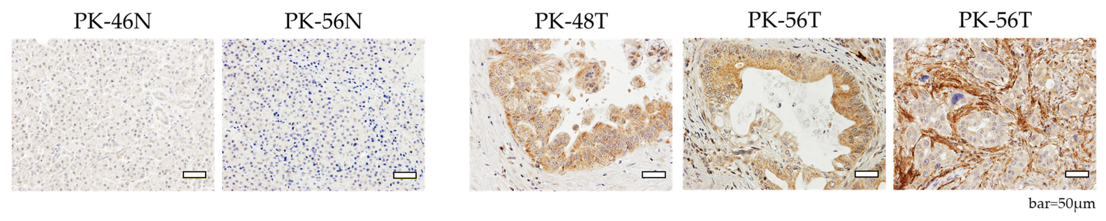To evaluate the spatial distribution of FAP, we performed immunohistochemistry on FFPE sections from matched patient samples. In N tissues (PK-46N and PK-56N), FAP expression was virtually undetectable. In contrast, T tissues (PK-48T and PK-56T) exhibited intense FAP immunoreactivity. FAP was observed not only in the surrounding stromal fibroblasts, consistent with its role as a cancer-associated fibroblast (CAF) marker, but prominently within the pancreatic cancer cells themselves (