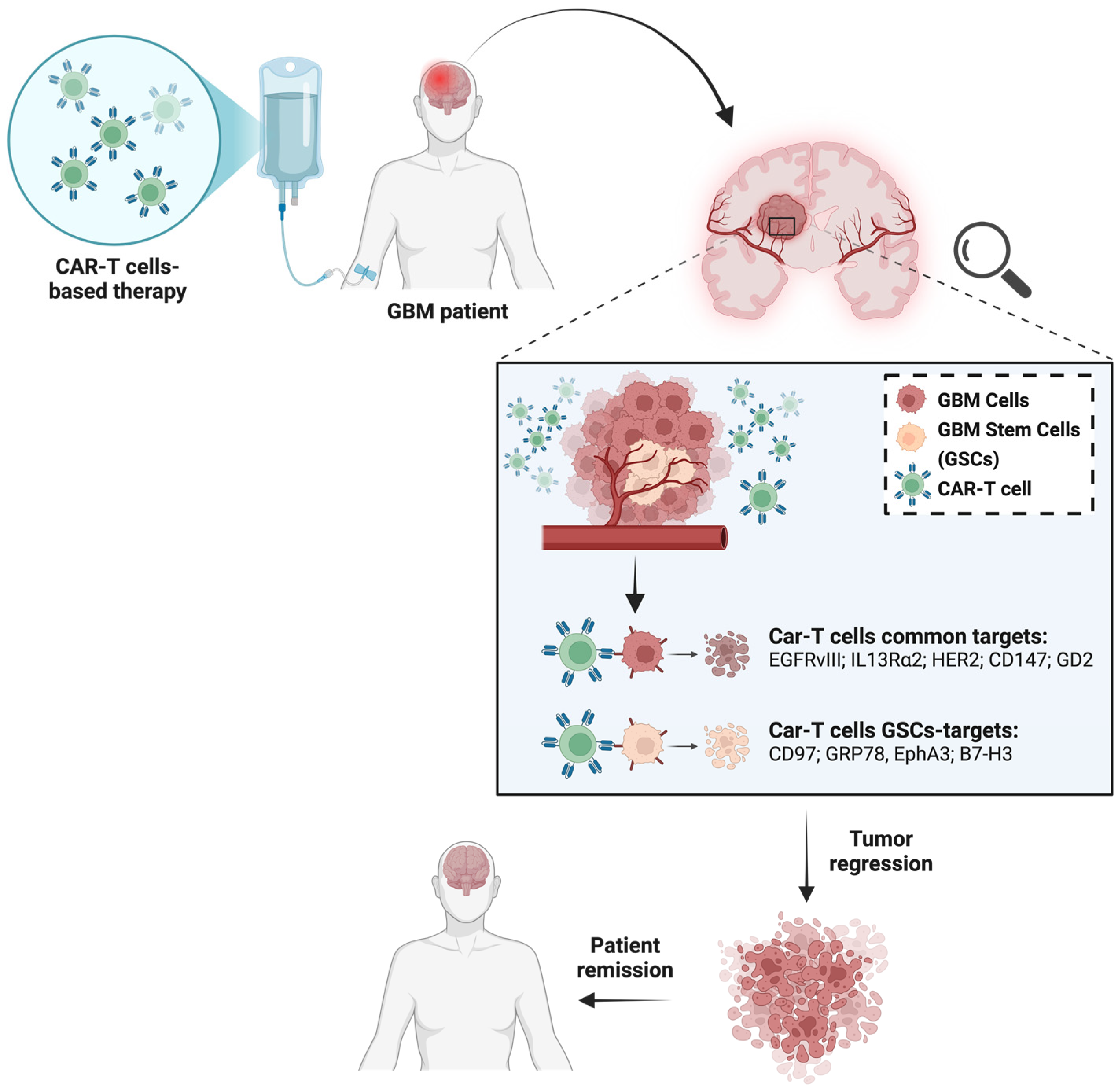 - Pant, A.; Lim, M. CAR-T Therapy in GBM: Current Challenges and Avenues for Improvement. Cancers 2023, 15, 1249. [Google Scholar] [CrossRef]