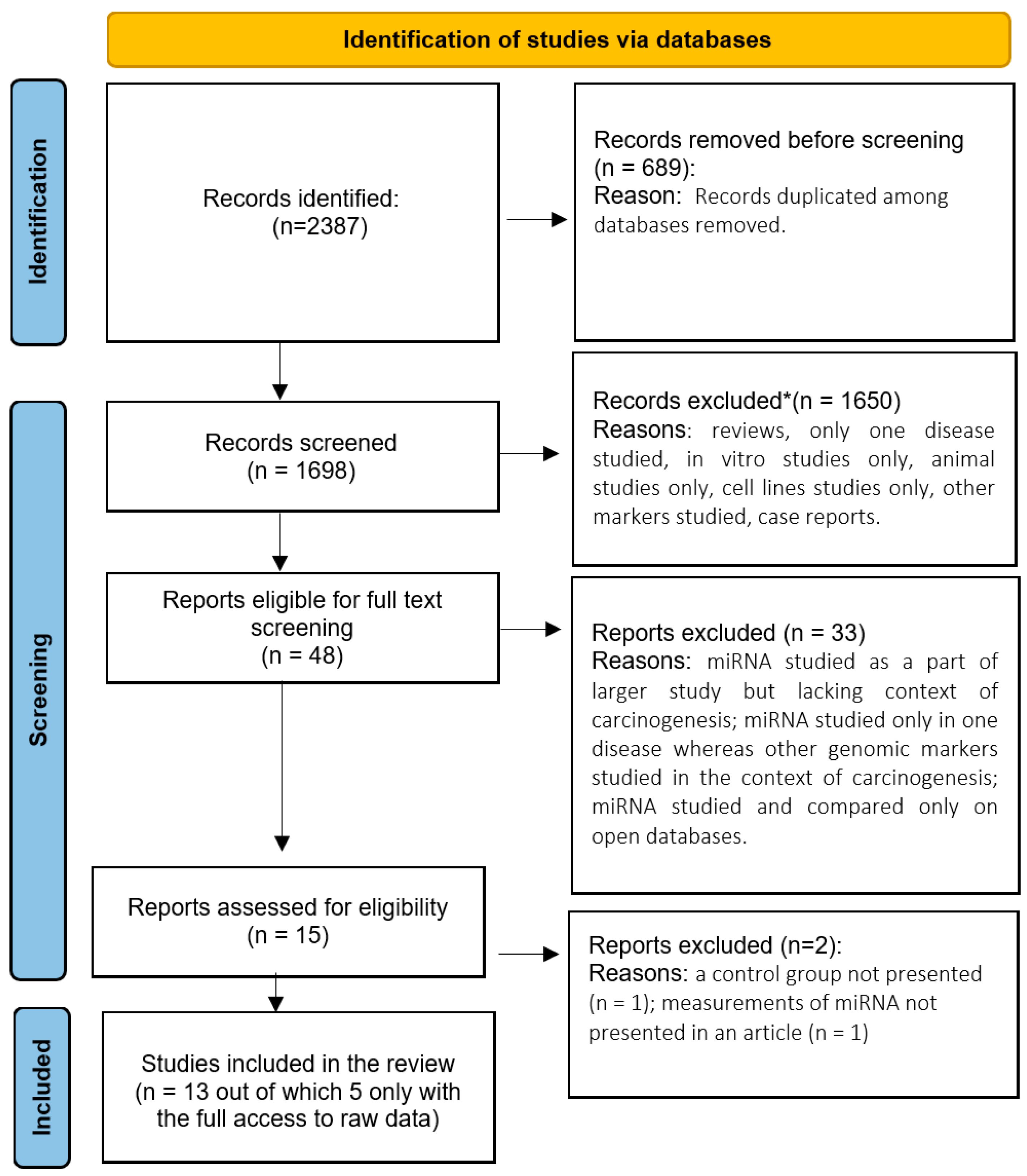 - Full-text original articles in English with available dataset or raw data on miRNA expression in both diseases.