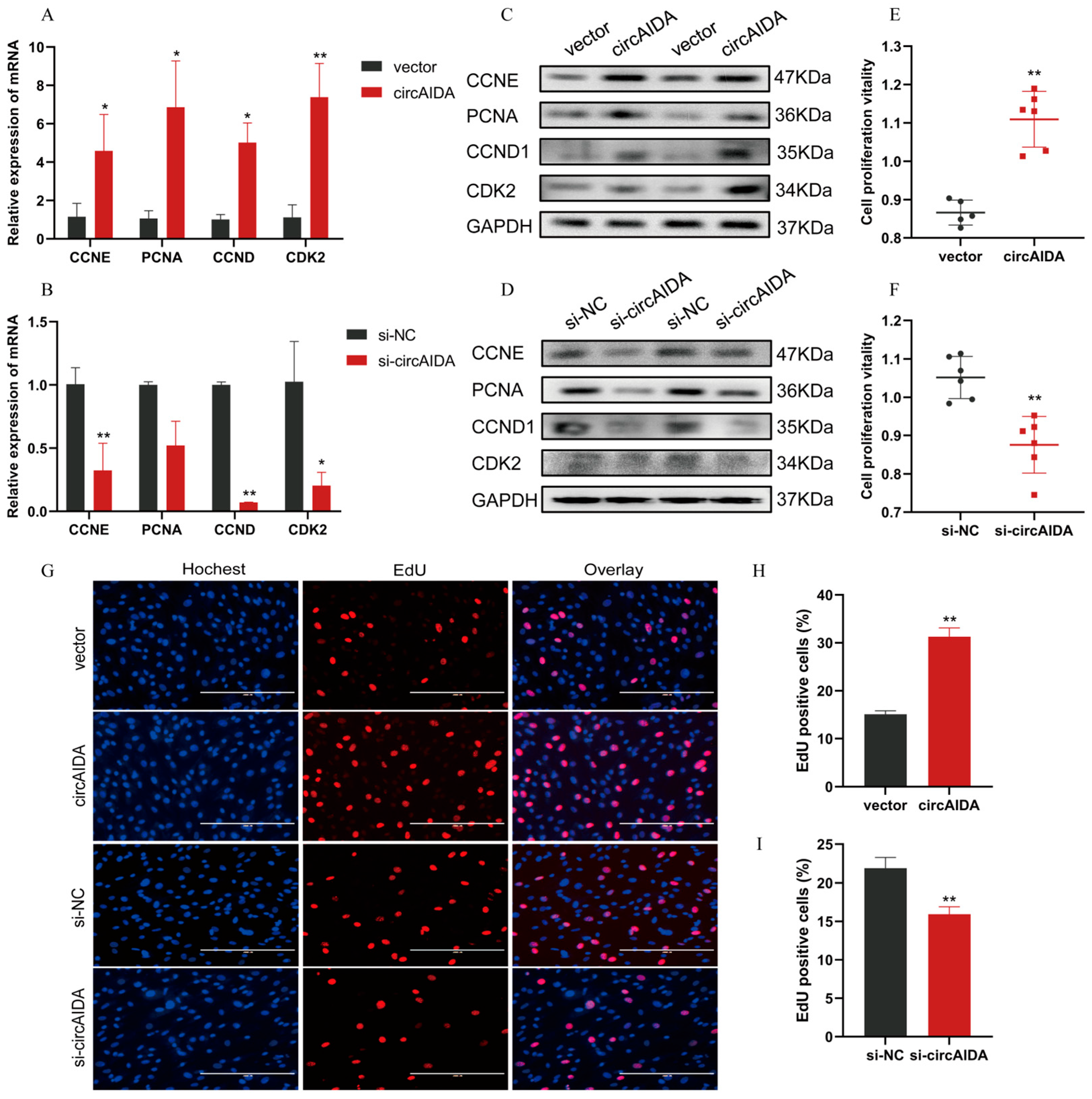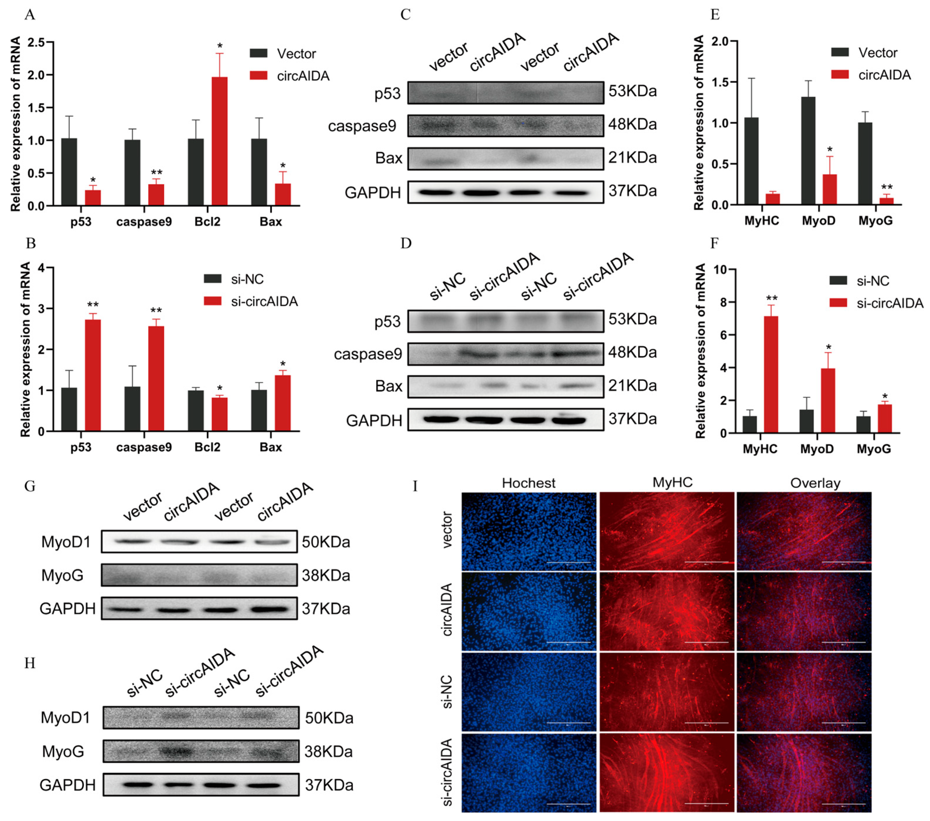 - circAIDA promotes myoblast proliferation and inhibits apoptosis and differentiation in vitro, while weakening skeletal muscle regeneration in vivo.