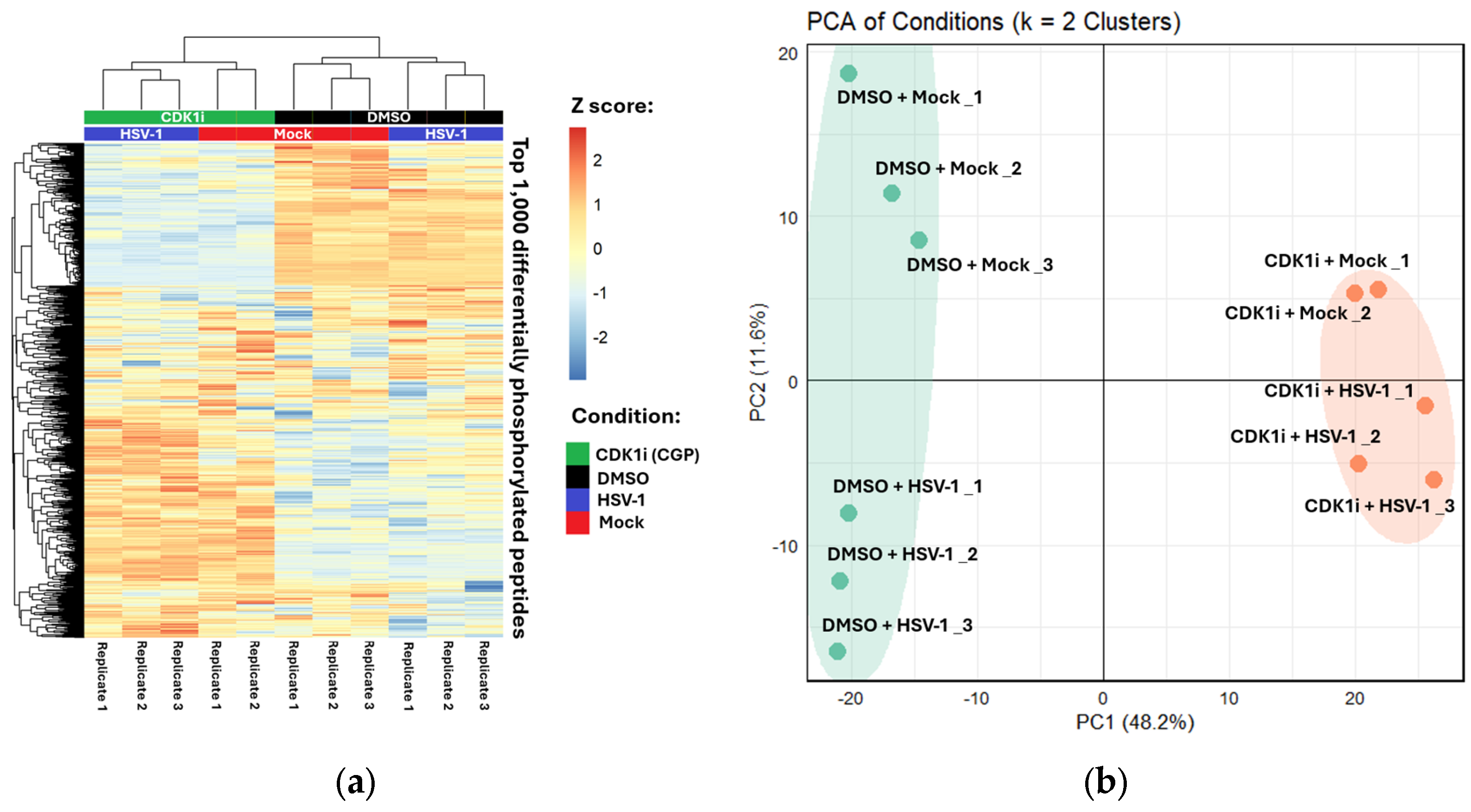 3.6. HSV-1 Reshapes the CDK1-Inhibited Phosphoproteome