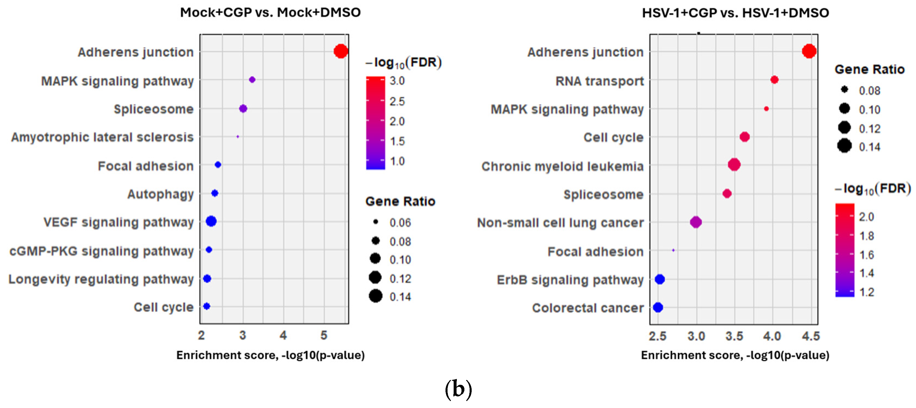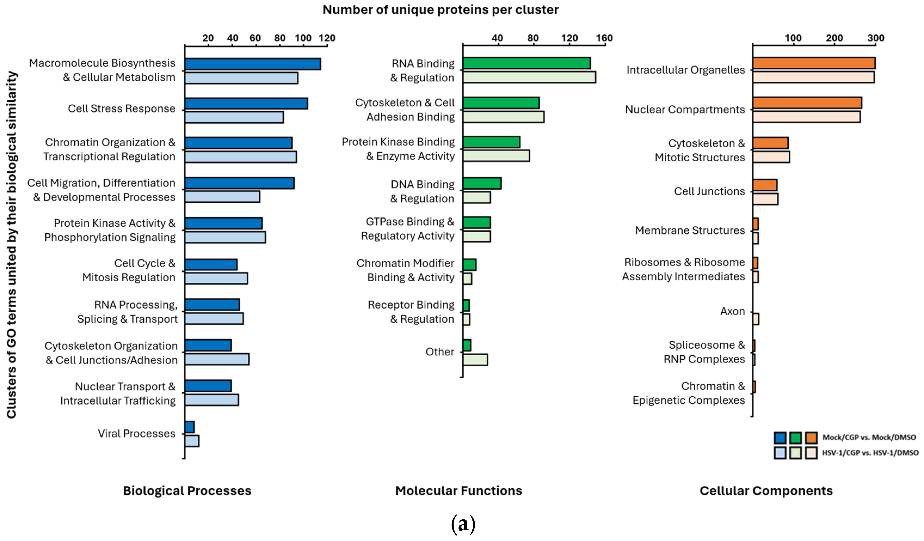 3.9. Phosphoproteomic Analysis: Gene Ontology (GO) and Pathway Enrichment Analyses of Differentially Phosphorylated Proteins Under CDK1 Inhibition with or Without HSV-1 Infection