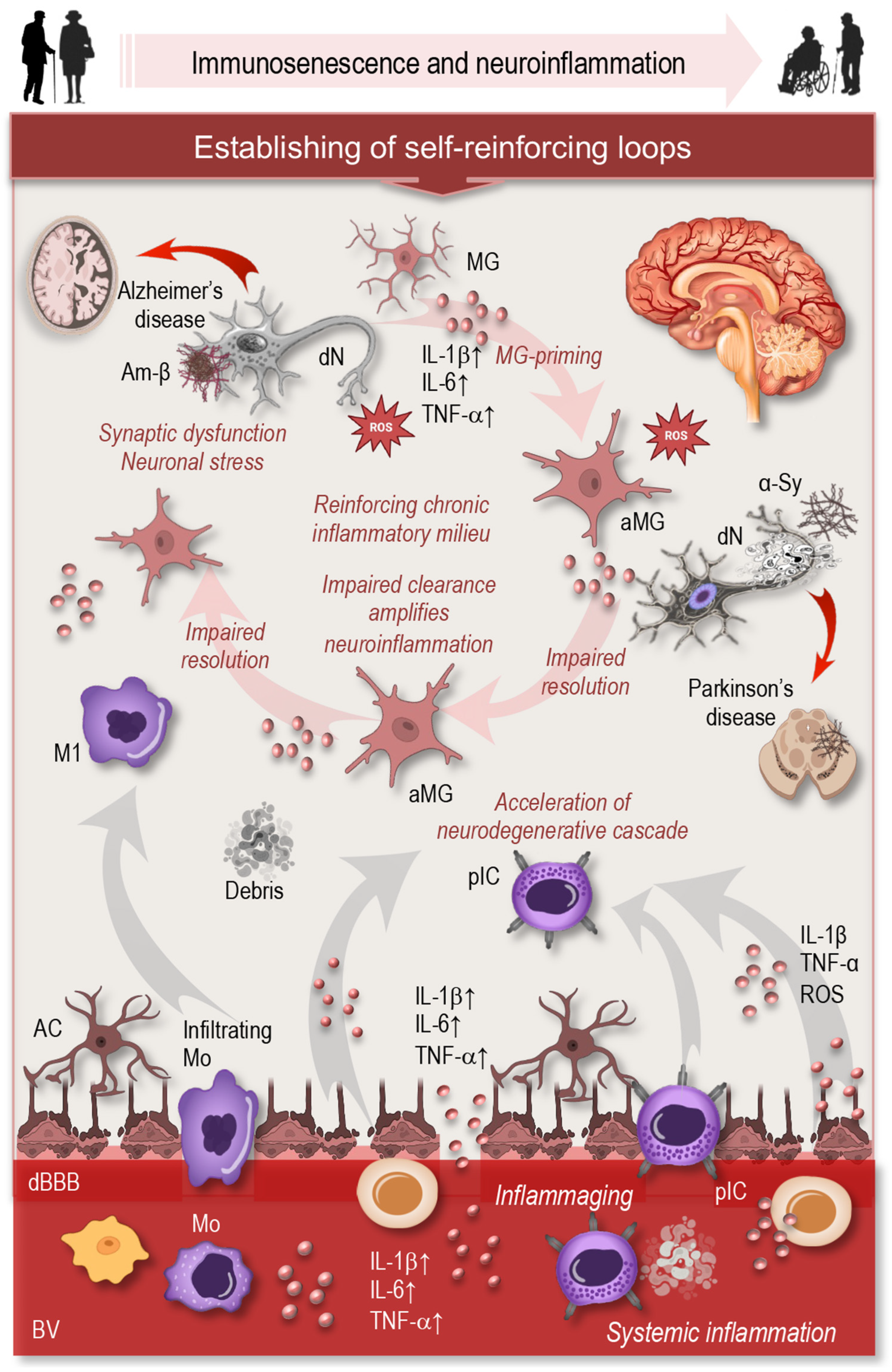 - Müller, L.; Di Benedetto, S. Aging brain: Exploring the interplay between bone marrow aging, immunosenescence, and neuroinflammation. Front. Immunol. 2024, 15, 1393324. [Google Scholar] [CrossRef]